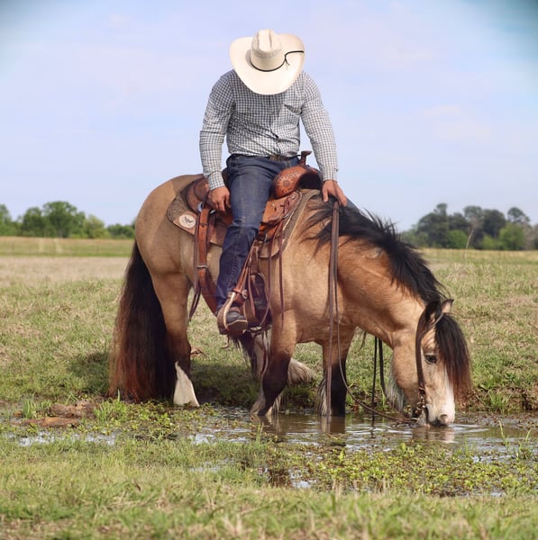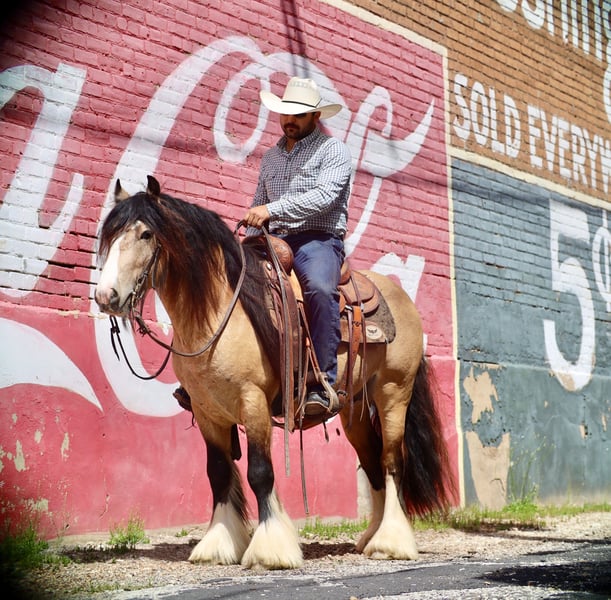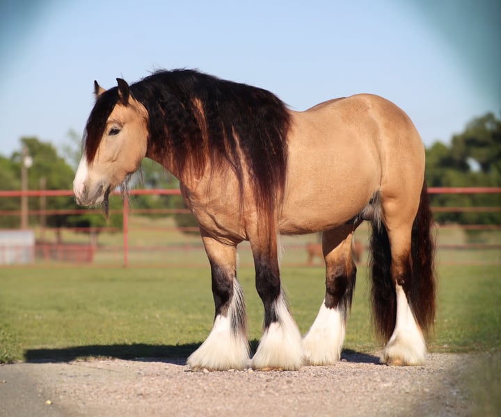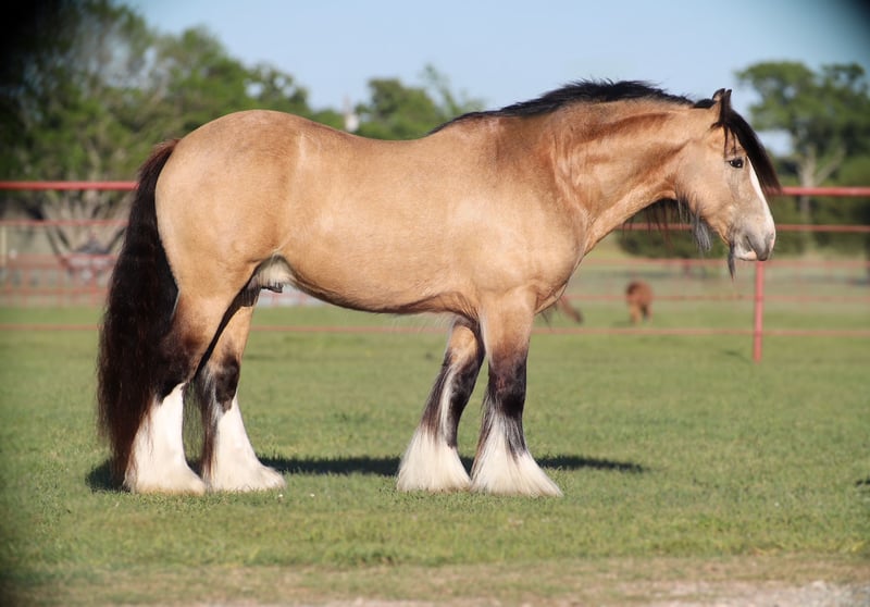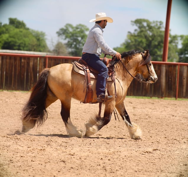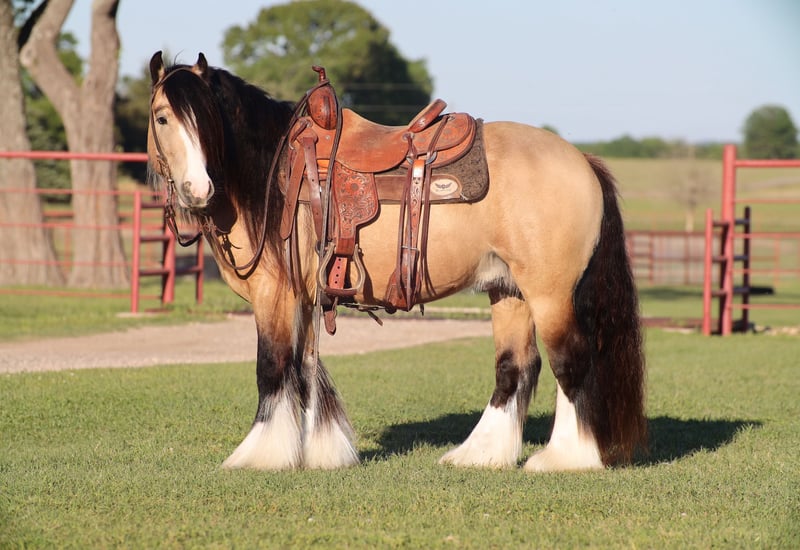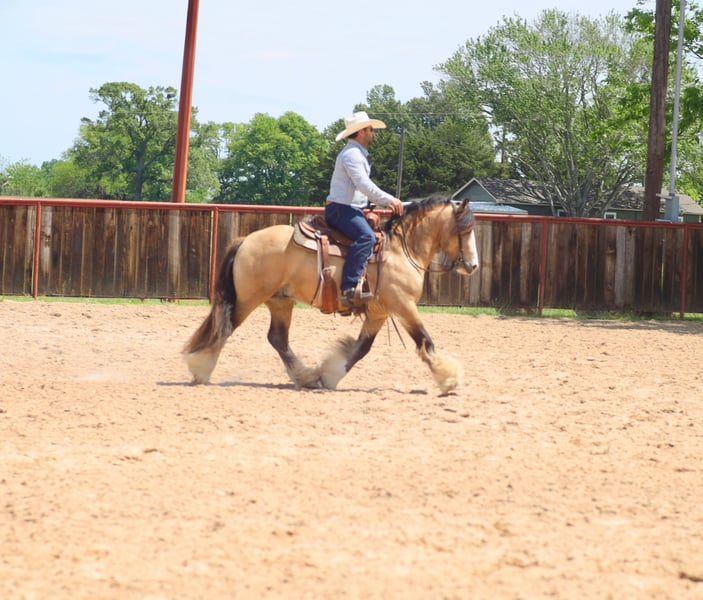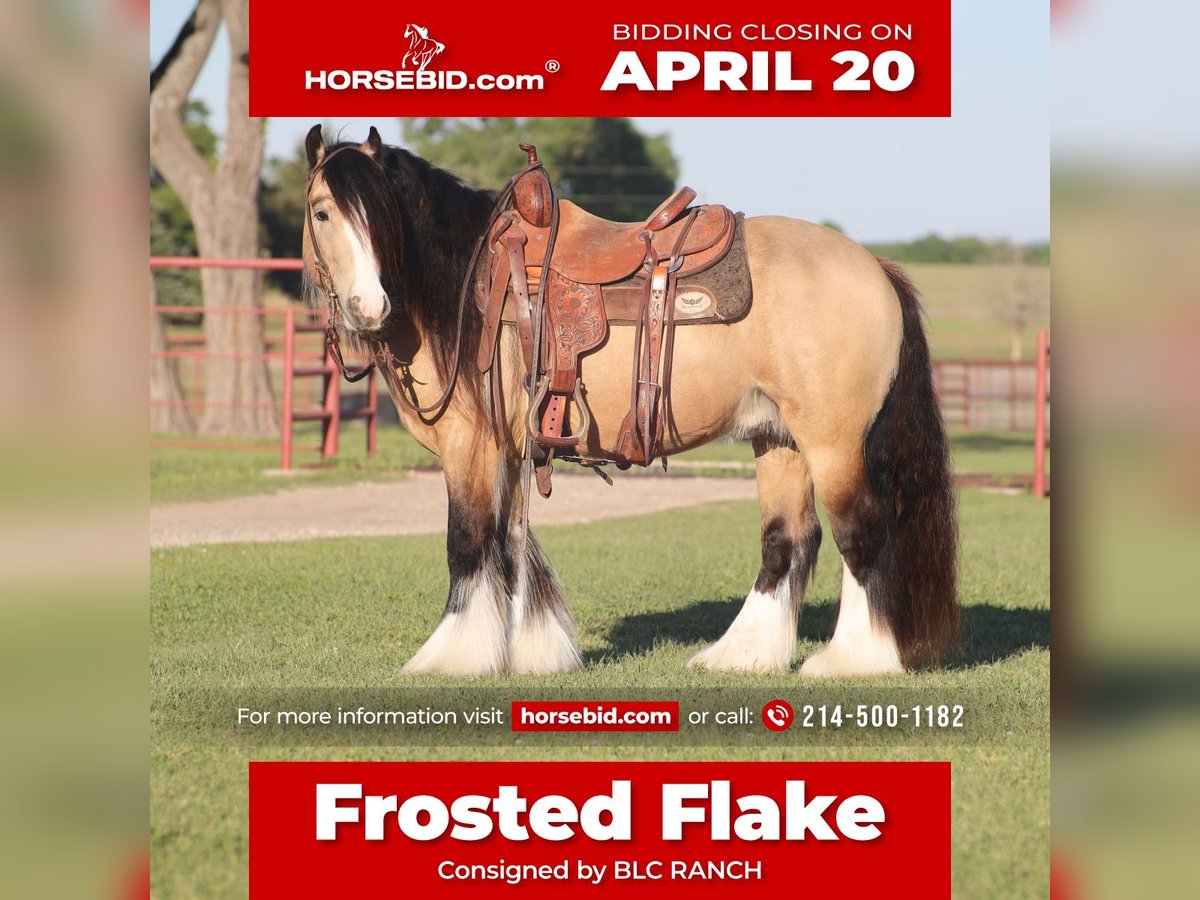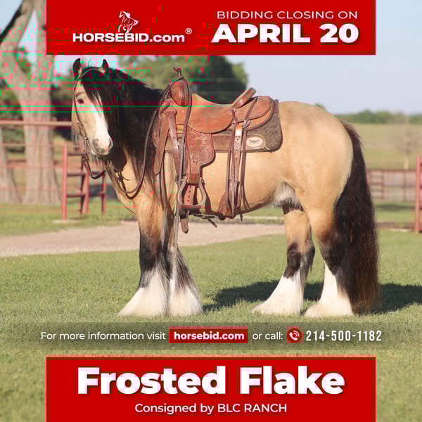 ⚜️𝐭𝐡𝐞 𝓔𝓵𝓲𝓽𝓮 𝐒𝐩𝐫𝐢𝐧𝐠 𝐂𝐥𝐚𝐬𝐬𝐢𝐜⚜️ Happening now thru MONDAY | APRIL 20th - Available EXCLUSIVELY on HorseBid's website! For more details and to register visit: www.Horsebid.com CONSIGNOR CONTACT: BLC RANCH 214-500-1182 LOCATION: Grand Saline, TX BREED: Gypsy REGISTERED: Yes REGISTERED NAME: Smokin feather of sky horse COLOR: Buckskin HEIGHT: 13.3 AGE: 5 GENDER: Stallion Everyone loves Frosted Flakes!!! Meet Frosted Flakes , the coolest gypsy stallion around. Double registered and standing right under 14 hands with plenty of bone and shape. He has a great mind and is so easy to be around, most of the time you forget he’s a stallion. We have owned frosted flake since he was 6 months old and our three year old son at the time named him . And what a name that fits him so well. We started him from the ground up. With him there was never a hard day, he’s always been extremely willing and trainable. Over the years we have done everything off of him from gathering cattle/basic ranch work to hog hunting with dogs. He’s spent a many of miles in the trailer riding around town and learning life. You just grab your halter and he will meet you at the gate. He bathes, brushes, and stands tied like a gentleman. He would make an excellent gelding if that’s your desire, but I will say he has an impeccable attitude and is one of the most good minded stallions I have ever been around. We have had children , dogs, deer and really anything you can think of around him and he just has the sweetest old man heart. We bred him to 5 quarter horse mares last year and he handled it without any issues. His foals have great disposition, confirmation, and color. Your options an unlimited with him he has his whole life ahead of him. Don’t miss this exceptional stallion please call 214-500-1182 let’s talk about him. Sound in every way.