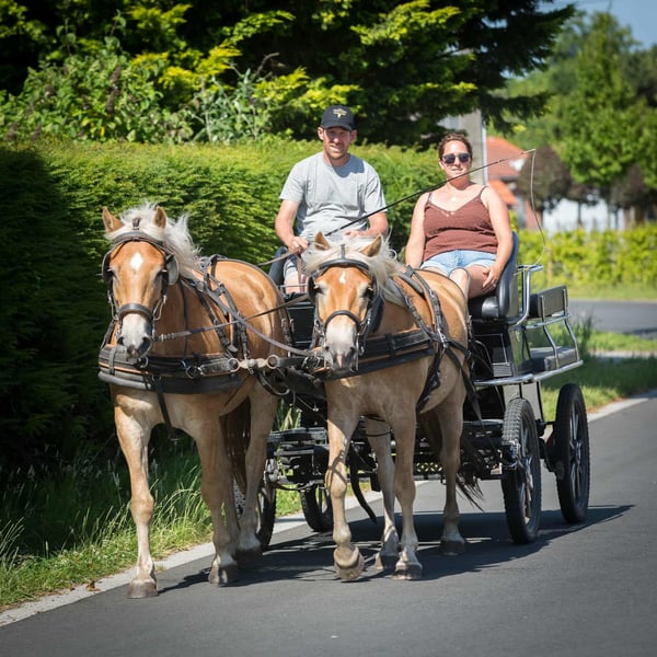 Haflinger colts for sale – Stardust van 't Vossenhol (3 years) (right in the carriage) and Shadow van 't Vossenhol (3 years) Born: 20/06/2022 Height: 1.51m and 1.47m • Sire: Liz Spielberg • Training & experience: • Ridden under saddle, both with and on a lunge halter. Both have jumped a little bit of basic jumps, but given their age, not high. • They are also familiar with our obstacle course. • Both have been on outdoor rides and on trekking. • Good with the farrier and always properly vaccinated. • They can work together in a double harness for the carriage. • Character: Affectionate, sweet, calm, and willing – a reliable partner for various disciplines. Versatile young Haflingers ready to grow together, both under saddle and for the carriage. Not suitable for beginner riders or drivers due to their age. Interested? Feel free to contact us for more information or a viewing. Send a WhatsApp for more videos under saddle or in the carriage. They have been bred by us, so their entire history is known. Higher price range 13,000 for the two together. 0495888528