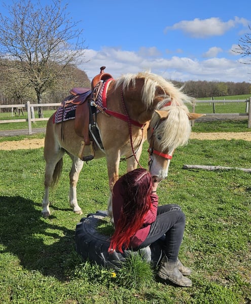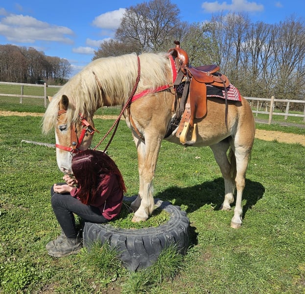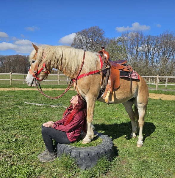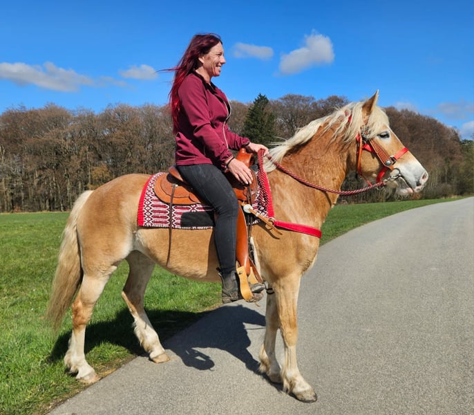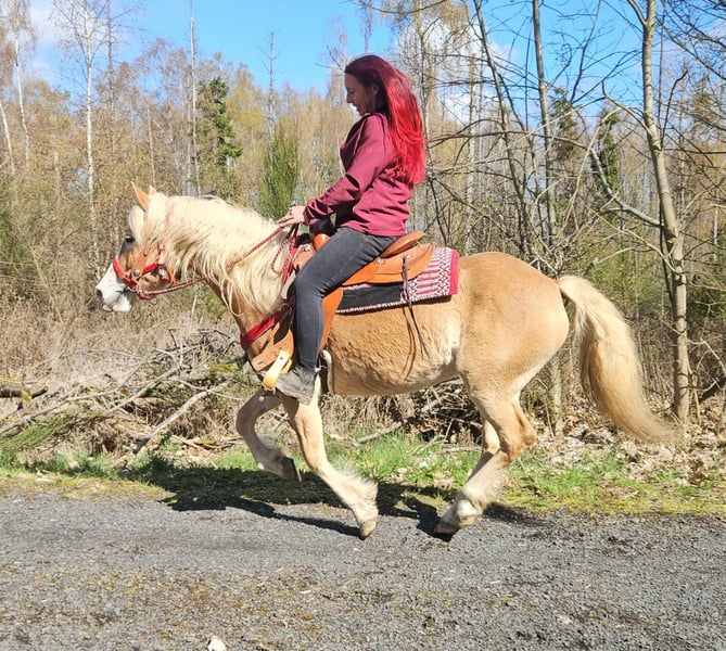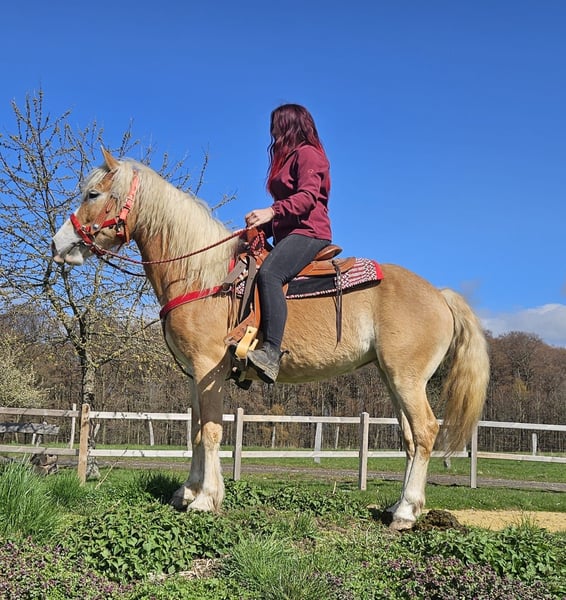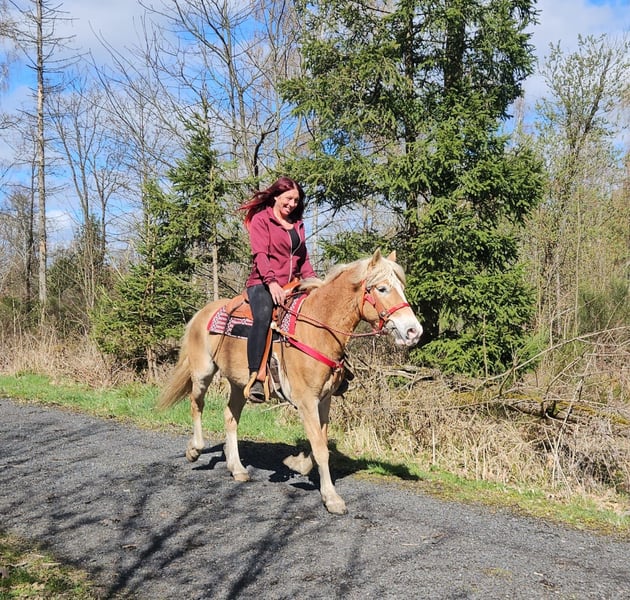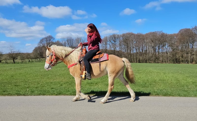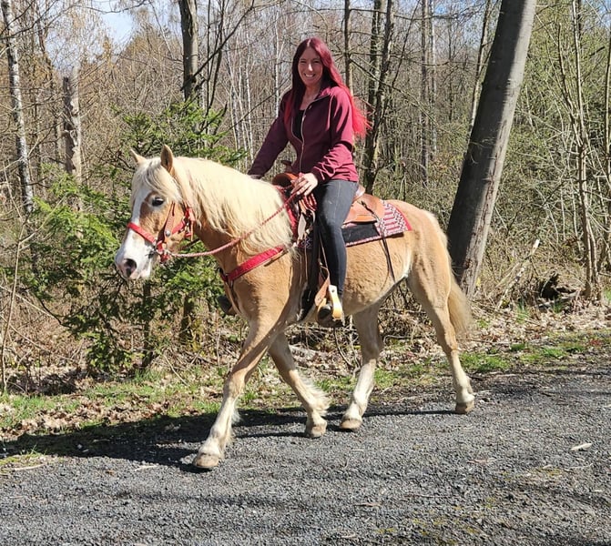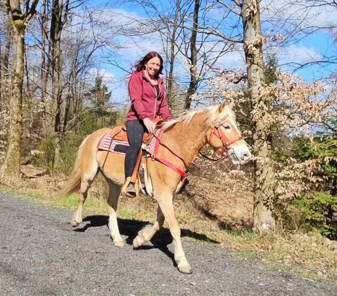 Haflinger-Stute – brav, zuverlässig & angenehm zu reiten Vincita Alter: 6 Jahre Geschlecht: Stute Stockmaß: ca. 1,48 m Preis: 6600 ,- AKU: vorhanden Beschreibung: Diese 6-jährige Haflinger-Stute überzeugt durch ihr freundliches Wesen und ihre Zuverlässigkeit. Mit einem Stockmaß von ca. 1,48 m ist sie vielseitig einsetzbar und sowohl für Jugendliche als auch für Erwachsene gut geeignet. Im täglichen Umgang zeigt sie sich absolut brav und unkompliziert. Putzen, Führen und Satteln sind für sie selbstverständlich und verlaufen ruhig und gelassen. Auch unter dem Sattel ist sie angenehm zu reiten. Sie zeigt sich ausgeglichen, kooperativ und reagiert zuverlässig auf die Hilfen ihres Reiters. Dadurch vermittelt sie ein sicheres Reitgefühl und eignet sich ideal für den Freizeitbereich sowie entspannte Ausritte ins Gelände. Geeignet für: Freizeitreiter, Jugendliche oder Wiedereinsteiger, die ein zuverlässiges und gutmütiges Pferd suchen. Pflege & Betreuung: – Regelmäßig entwurmt – Schmied gepflegt – Osteopathisch betreut Zusatzangebote: Westernsättel, Trensen und weiteres Zubehör erhältlich. Service: – Transport kann organisiert werden – 3 Monate Umtauschrecht Proberitt: – 35 € (jedes weitere Pferd 25 €) – Wird beim Kauf am selben Tag angerechnet Preisnachlass bei sofortiger Mitnahme oder Transport am gleichen Tag: – Kategorie 1: 100 € – Kategorie 2 (ab 5.000 €): 250 € Telefon: 0171 – 4001968 Täglich erreichbar von 8–20 Uhr