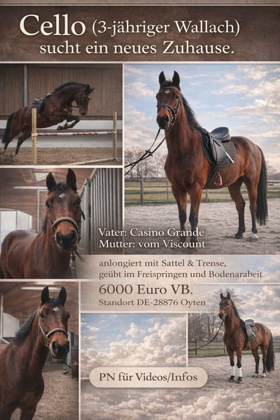 Deze driejarige ruin Cello is een bruin paard, afstammend van Casino Grande, gefokt door de familie Sosath. Zijn vader, Casino Grande, overtuigt in zijn werk door zijn rijvaardigheid, instelling en bewegingstechniek. Hij heeft succesvolle resultaten behaald in springen op 1,55 m, bijvoorbeeld op het Duitse kampioenschap in Balve en het Wereldbeker-toernooi in Leipzig, evenals op andere internationale wedstrijden boven de 1,55 m. Casino Grande heeft al talrijke succesvolle nakomelingen, waaronder de winnende merrie op de merrie-eliteshow in Rastede, de Oldenburgse kampioene in de springpaardenklasse en de hengsten die gekeurd zijn tijdens de keuring in München, evenals andere gekeurde hengsten. Veel van zijn nakomelingen zijn succesvol op S-niveau (over 1,40 m). De moederlijn strekt zich uit via Viscount en Argentinus. Viscount was zelf succesvol in de S-klasse in zowel springen als dressuur. Zijn nakomelingen zijn al actief in S-proeven in dressuur en springen. Dit bevestigt zijn rijvaardigheid en bereidheid tot prestaties als erfgoed. Argentinus heeft meer dan 100 gekeurde zonen en heeft niet alleen naam gemaakt, maar is ook uitgegroeid tot een legende in de springsport. Cello is geboren in maart 2023, opgegroeid in een familieomgeving en wordt momenteel voorzichtig in de opleiding gebracht. Hij is zeer leergierig, luistert goed en wil altijd zijn best doen. Hij laat zich graag vlot saddelen en bitten en kent longeren in alle drie de basisgangen. Daarnaast is hij al bekend met grondwerk met cavaletti. Hij is smid- en dierenarts-gezind. De volgende stappen in zijn opleiding zijn vrijspringen en het dragen van het gewicht van een ruiter. Cello beschikt over een goede basis en is zeer compact gebouwd. Zijn huidige stokmaat is 1,62 m. De locatie van het paard is in Oyten. Cello kan op afspraak te allen tijde worden bezichtigd. Het paard wordt aangeboden in verband met het stoppen met de sport.