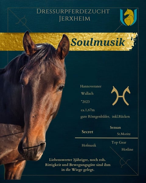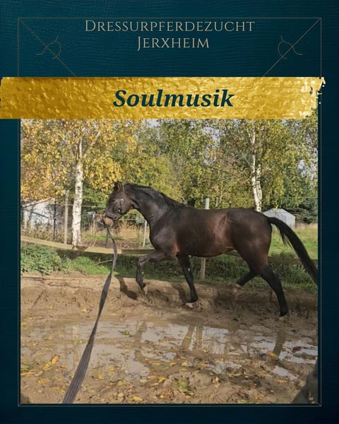 Soulmusik ist dunkelbrauner 3jähriger aus einer züchterisch, erfolgreichen Mutter. Ein Bruder ist 4j. belgischer Champion unter Soraya Hendrikx geworden, eine bewegungsstarke Schwester verbleibt in unser Zucht, ein herausragender Bruder ist über die Elite-Fohlenauktion verkauft. Soulmusik hat einen Schönheitsfehler, aufgrund einer ausgeheilten Verletzung hat er eine dicke Narbe auf dem vorderen Röhrbein. Aus diesem Grund bieten wir ihn trotz der aktuellen guten Röntgenbilder incl. Rücken deutlich unter Wert an. Seine Reitpferdequalitäten sind keinesfalls eingeschränkt. Er überzeugt mit aktiver Hinterhand und zeigt Potential für die Versammlung! Erste Runden hat an der Longe hat er gelassen absolviert. Hier bietet sich die Chance ein qualitätsvolles Pferd für die Zukunft zu erstehen! Soulmusik is a dark bay 3-year-old out of a highly successful breeding mare. One brother became a 4-year-old Belgian champion under Soraya Hendrikx, a very expressive-moving sister remains in our breeding program, and an outstanding brother was sold through the elite foal auction. Soulmusik has a minor cosmetic flaw: due to a healed injury, he has a thick scar on the front cannon bone. For this reason, we are offering him well below his actual value, despite his currently good X-rays, including his back. His riding horse qualities are in no way limited. He was never lame, even during the acute phase of the injury, which occurred two years ago. He impresses with an active hind leg and shows clear potential for collection. He has calmly completed his first sessions on the longe. This is a great opportunity to acquire a high-quality horse for the future!