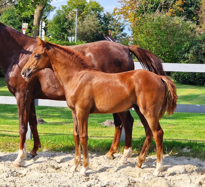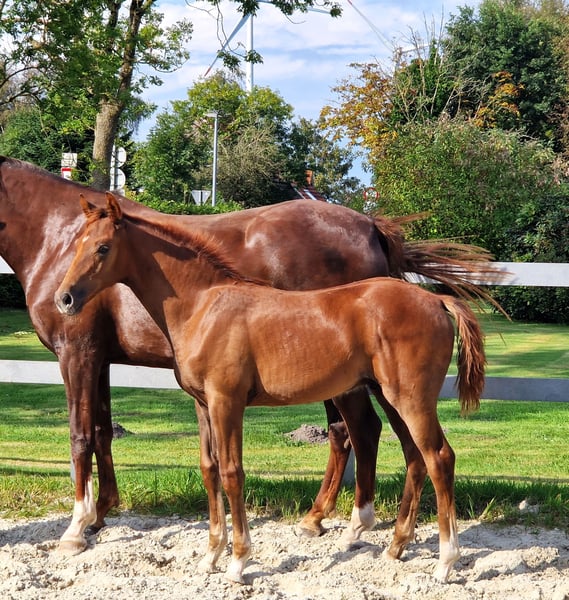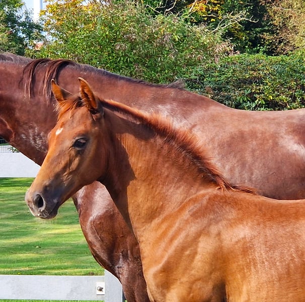 V-Gold *** For Sale! Chic dark chestnut colt by shooting star "V-Plus" out of a "De Niro Gold x Sunny Boy" dam. Equipped with good GGA and a correct exterior, this beauty enchants at first sight! https://www.youtube.com/watch?v=eHdg95m61Sc www.fohlenfreunde-sportpferde.de