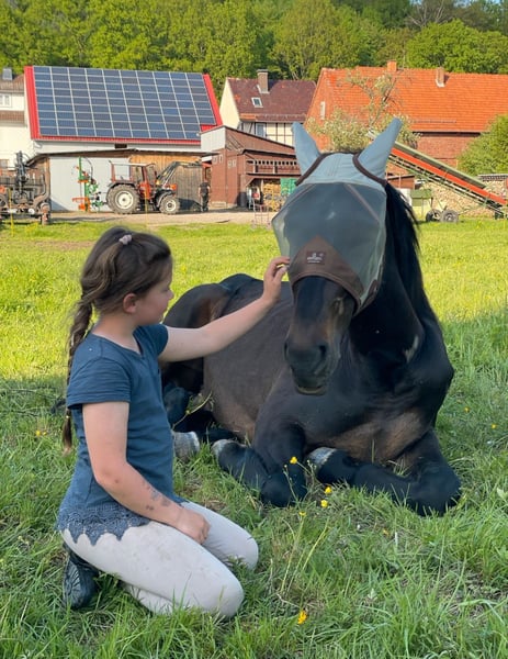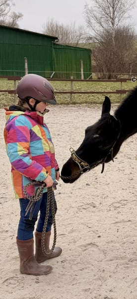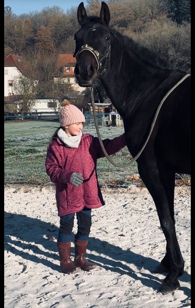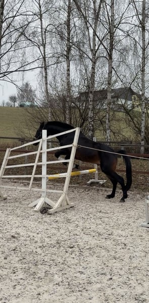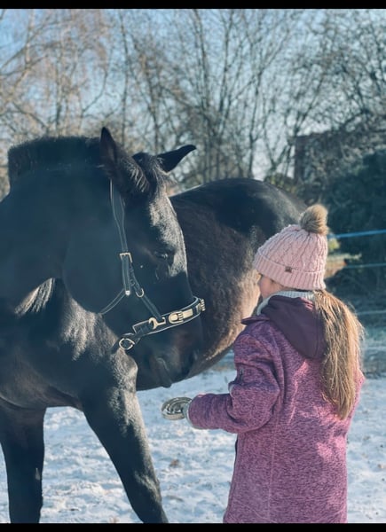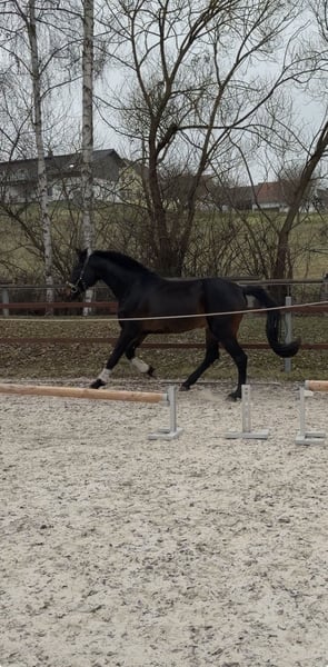 Cadeau – Wallach mit Spitzenabstammung und Herz aus Gold Zum Verkauf steht der bildschöne 3-jährige Wallach Cadeau, der mit exzellenter Abstammung, moderner Sportpferdeoptik und einem außergewöhnlich angenehmen Charakter überzeugt. Abstammung: Contendro I x Laura x Laurentio Mit Contendro I als Vater – einem der bedeutendsten Vererber internationaler Spring- und Vielseitigkeitspferde – bringt Cadeau beste sportliche Voraussetzungen mit. Auch dressurmäßig glänzt sein Pedigree mit Namen wie Light and Easy, Laurentio und Weltmeyer. ➡️ Stammbaum siehe Fotos. Cadeau präsentiert sich in edler schwarzbrauner Jacke, mit einem aktuellen Stockmaß von ca. 1,65 m und einem harmonischen, modernen Exterieur. Er wurde mit drei Jahren kastriert und konnte sich dadurch körperlich besonders gleichmäßig und gesund entwickeln. Er verfügt über drei gute Grundgangarten und überzeugt vor allem durch seine hervorragende Arbeitseinstellung: Cadeau arbeitet stets motiviert, aufmerksam und brav mit. Aufgrund seines verlässlichen Wesens darf auch unsere 9-jährige Tochter viel mit ihm machen – von Freiarbeit über Longieren bis hin zu Verladen und Reiten. Als typisches Jungpferd bringt er eigene Ideen mit, ist dabei jedoch fein ansprechbar, gut führbar und sehr lernwillig. Klare, faire Führung akzeptiert er problemlos und entscheidet sich immer für die Mitarbeit. Die Arbeit mit ihm macht einfach unglaublich viel Freude. Charakterlich zeigt sich Cadeau: • nervenstark • zuverlässig • unkompliziert Er ist brav beim Schmied und Tierarzt, lässt sich problemlos verladen und bleibt auch im Gelände stets ruhig und gelassen. Unbekannte Dinge werden neugierig und entspannt mit dem Maul erkundet. Auch im Freispringen kann Cadeau bereits überzeugen: selbstsicher, konzentriert und mit viel Übersicht meistert er die Sprünge – ein weiteres Zeichen für seine sportliche Perspektive. Cadeau kennt sowohl 24/7-Weidehaltung als auch Boxenhaltung im Winter auf unserem kleinen landwirtschaftlichen Betrieb. Dort ist er verschiedenste Maschinen, Geräusche und Tiere gewohnt und entsprechend abgeklärt. Ein rundum talentierter Youngster mit bestem Interieur, ideal für Reiter, die ein Pferd mit Perspektive für den gehobenen Sport suchen – und gleichzeitig einen verlässlichen, freundlichen und nervenstarken Partner für Freizeit und Ausbildung. Verkauf schweren Herzens und AUSSCHLIESSLICH aufgrund meiner gesundheitlichen Situation. Gerne erzähle ich dazu mehr im persönlichen Gespräch.