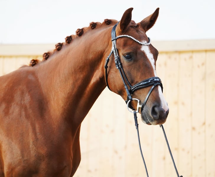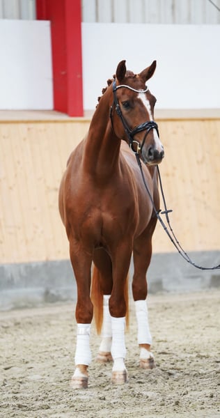Promising Young Prospect for Dressage Sport For sale is a 4-year-old chestnut gelding with excellent basic prerequisites for dressage. He impresses with three very good basic gaits, particularly noteworthy are his uphill canter and an expressive, rhythmical walk. In daily handling, he is absolutely uncomplicated, friendly, and reliable. He loads without any issues, even alone, is well-behaved with the farrier, and is always pleasant to handle – even at competitions. A horse that leaves nothing to be desired in terms of character. He can also be easily managed by less experienced riders and is suitable as a transition horse. Under saddle, he works with great willingness to learn and always shows himself to be rideable and cooperative. He is currently placed in dressage horse A and impresses both at competitions and in training with his positive work ethic and pleasant riding feeling. 0172/4336587 Information without guarantee Price plus VAT On Instagram Frederike_ni