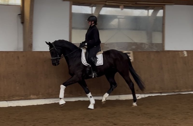 *2022 Hanoverian Black Gelding, approximately 16.1 hh by Don K, dam of Dancing World This black gelding features three very good basic gaits, charm, and a lot of expression. He has an excellent work ethic and is completely straightforward and eager to learn. A fantastic horse for competitive riding. A horse that brings joy every day. Please contact us only at +49 171 5477697. We have other horses for sale as well—just give us a call; perhaps we have something suitable for you.