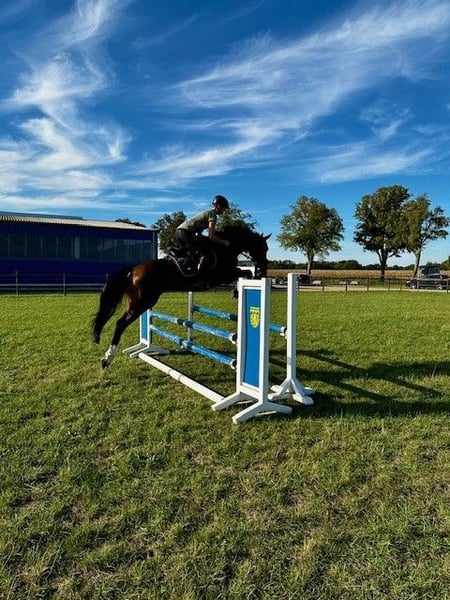 Dancier Gold x Franziskus Deze prachtige ruin verenigt alles wat ambitieuze ruiters zich wensen: braaf, onverstoorbaar en in de omgang absoluut ongecompliceerd - maar met voldoende GO-instelling en een zekere vonk "elektriciteit". Zowel in de dressuurring als bij het springen maakt hij een zeer goede indruk. Hij overtuigt met kwaliteit, rijbaarheid en plezier in het werk en toont daarmee een veelbelovende veelzijdige aanleg. Door zijn natuurlijke rust en kalmte brengt hij bovendien ideale voorwaarden voor de Hunter Springsport met zich mee. Helemaal ongecompliceerd in alles - of het nu gaat om de dagelijkse omgang, het laden, of op vreemde locaties - hij maakt het zijn ruiter altijd gemakkelijk. Aan het einde van zijn derde levensjaar is hij voorzichtig onder het zadel gebracht en sindsdien wordt hij regelmatig 2-3 keer per week gewerkt. Daarnaast kent hij het om in een kudde op de wei te staan - de beste voorwaarden voor een evenwichtig en gezond paard. Hij komt rechtstreeks van de fokker en is daar zeer goed verzorgd en beschermd opgegroeid. Op de huidige video's loopt hij nog zonder ijzers. Video Dressuur https://youtu.be/klsvbqOWgJk?si=u_SpKGThrCBUwCYt Video Springen https://youtu.be/-rufzvYu_Ec?si=VTH1pnLA6BwQdXzI youtube: Sportpferde Marco Weber Goede keuring is aanwezig.
