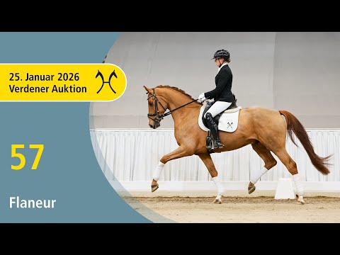 Flaneur ist ein Pferd mit auffälligem Talent und ausgeprägter Leistungsbereitschaft. Der erfolgreiche Mutterstamm bringt unter anderem den Prämienhengst Quando Unico FRH v. Quantensprung (DRE: international S* mit Simone Pearce), Divino v. Donautanz (DRE: Grand Prix mit Vanessa Grimm) sowie die gekörten Hengste Secreton MW v. Secret und Zoomaton v. Zoom hervor. 1. Generation Bes. Prämientöchter: HannPr Be Nice of Ohana v. Bon Courage. 2. Generation Sportpferde Dressur: Divino 18 v. Donautanz (DRE: Grand Prix mit Vanessa Grimm,Dressurprüfung Kl.S*** mit Piaffe und Passage 2019,Dressurprüfung Kl.S*** mit Piaffe und Passage 2018,Dressurprüfung Kl. S*** - Grand Prix Kür - 2018,Dressurprüfung Kl.S*** mit Piaffe und Passage 2018,Dressurprüfung Kl.S*** mit Piaffe und Passage 2017,Dressurprüfung Kl. S*** - Grand Prix Kür - 2017,Dressurprüfung Kl.S*** mit Piaffe und Passage 2016,Dressurprüfung Kl. S*** - Grand Prix Special - 2015,Dressurprüfung Kl. S*** - Grand Prix Kür - 2014,Dressurprüfung Kl.S*** mit Piaffe und Passage 2014); Diaton FRH v. Dimaggio (DRE: S* mit Nicole Wego-Engelmeyer,Deutsche Meisterschaft der Junioren Dressur -Wertung- 2025,Nationenpreis Dressur Kl.M Junioren -international- 2025,Deutsche Meisterschaft der Junioren Dressur -Wertung- 2024,Dressurpferdeprfg. Kl.L Bundeschampionat 5 jährige 2021); gek. Hengst Quando Unico/Quando Unico FRH v. Quantensprung (DRE: int. S* mit Simone Pearce,Nationenpreis Dressur Kl.M Junioren -international- 2022,Dressurpferdeprüfung -international- WM 7jährige Kl.S 2021,Verden 2016,HM 2016: 280.000 €,Prä.Dre. Körung Verden 2016); Don Novell K v. Dancing World (DRE: M* mit Lilli Elen Seidel). Aufbauprüfungen Dressur: gek. Hengst Secreton MW v. Secret (DRE: M mit Leslie Rohrbacher,Porta Westfalica 2021); gek. Hengst Zoomaton v. Zoom (DRE: M mit Susann Göbel,Redefin 2021); Dr. Sott v. Dr. Watson (DRE: L). Besondere Sportergebnisse: Laponio v. Laurentio (Championat f. Reitpferde 2009,VA 2010). gekörte Hengste: gek. Hengst Dafoe/Dafoe 3 v. Dimaggio Black (Redefin 2023); gek. Hengst v. Morricone I (Verden 2022). Auktionspferde: Light and Cool v. Light and Easy (VA 2010); Divina Comedia v. De Niro (VA 2003). Bes. Prämientöchter: HannPr Benissima v. Benetton Dream; StPr Blind Date Bailoda v. Benetton Dream; StPr Florenza Filana v. Fidertanz. 3. Generation Sportpferde Dressur: Tenor 21 v. Davignon I (DRE: S** mit Heyser-Burger,Nicola); Easy Boy 20 v. Earl (DRE: M* mit Vanessa Engelen). Auktionspferde: Sally 744 v. Scolari (VA 2017); Fandango v. Fürst Nymphenburg (FoVA 2010); Solitär v. Stedinger (VA 2012); Favor v. Fidertanz (VA 2012,FoVA 2008). Bes. Prämientöchter: StPr Hawai v. Hohenstein (Louis Wiegels-Schau Sandbostel 1999). 4. Generation Bes. Prämientöchter: EM Scarlet WF v. Sam Steele; StPr Wien v. Weltmeyer. 5. Generation Sportpferde Dressur: Humboldt 11 v. Hohenstein (DRE: S** mit Jessica Dahms); Forrest Gump 131 v. Fahrenheit (DRE: M** mit Luna Steingens); HannPrA Bellezza SB v. Bon Coeur (DRE: M* mit Sonja Barabasch); Bon Chance/Bon Chance 6 v. Buddenbrock (DRE: M* mit Sonja Barabasch); Wittfield 2 v. Wembley (DRE: M mit Raab,Marion). Sportpferde Springen: Adelie/Aurora 35 v. Pius (SPR: 1,30 m mit Dirk-Ulrich Neumann). Aufbauprüfungen Dressur: Bonne Belles v. Bon Coeur (DRE: L). Aufbauprüfungen Springen: Cheyenne 1111 v. Collind (SPR: 1,30 m mit Oliver Tüpker); Ascot/Ascot 78 v. Quattro B (SPR: L); Dilleric 2 v. Dynamo (SPR: L). Auktionspferde: StPrA Heidekönigin/Heidekönigin 2 v. Hochadel (VA 2007,Herwart von der Decken-Schau Verden 2009); Welcome v. White Star (VA 2004); Winnetou 753 v. White Star (VA 2004); StPr Highlite/St.Pr.St. Highlite v. Hohenstein (VA 2006,Louis Wiegels-Schau Sandbostel 1999); Cabellero v. Carbid (VA 2002); Leonardo 409 v. Longchamp (VA 1999); Grisabelle v. Grand Cru (VA 1998); Aster v. Argument (VA 1992,Louis Wiegels-Schau Dobrock 1991); StPr Alabama v. Acapulco (VA 1990). Bes. Prämientöchter: StPr Empire v. Eklatant. Mutter: Benissima Prämierung: 2xIa. ZL: 9/7 ZSP: Feldprüfung Reitpferd - Trab 7,00 Galopp 7,00 Schritt 8,00 / Durchschnitt Rittigkeit 8,00 / Durchschnitt Springen 7,50 Großmutter: Hawai Prämierung: 3xIa. ZL: 16/12 ZSP: Stationsprüfung Reitpferd - Trab 8,50 Galopp 8,00 Schritt 8,50 ø Durchschnitt Rittigkeit 8,00 / ø Durchschnitt Springen 6,75 Das Pferd ist ein Verdener Auktionspferd und wird am 25.01.2026 online versteigert. Vom 12.01. bis zum 25.01. kann das Pferd jeden Tag beim öffentlichen Training besichtigt und ausprobiert werden. Das Startgebot bei der Versteigerung ist 8.000 Euro.