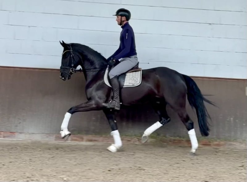 Dear prospective buyers, For questions or to arrange an appointment, please send us a WhatsApp or email. You can reach us by phone on weekdays, preferably around noon. If that is not possible, please just send a message and we will get back to you. We look forward to hearing from you! “Donni” is a very eye-catching horse with excellent quality. He shows himself equally well in all three basic gaits and already possesses great self-carriage and a secure sense of rhythm. After a short time under saddle, he proves to be incredibly teachable and intelligent. His upbringing has been gentle and very well managed, and he comes directly from the breeder. In handling, he is very sweet and totally people-oriented – a true “pocket horse.” A really great young horse that wants to be developed and is ready for the first starts in the dressage arena. Very interesting for those with higher expectations! Good vet check available. Directly from the breeder.