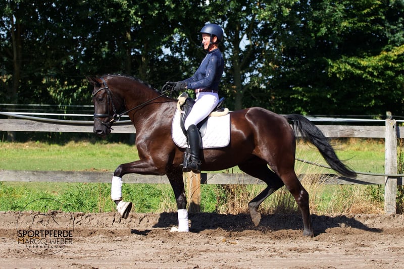 Hannoveraner | Wallach | *2021 | ca. 1,69 m ⚜️ Finest – Destano ⚜️ ❤️ Ein Traum in Schwarz ❤️ Ein im mittleren Rahmen stehender, äußerst typvoller Sohn des Finest – einfach zum Verlieben. Seit letztem Jahr schonend und mit viel Ruhe angeritten, zeigt er sich kooperativ, lernwillig und angenehm im Handling. Mit drei sehr guten Grundgangarten, natürlicher Bergauftendenz und der gewünschten Portion Fleiß ausgestattet, bringt er alles für eine erfolgreiche Dressurkarriere mit. 🏆 Bereits Reitpferde und Dressurpferde A platziert 🏆 Im Exterieur absolut korrekt, für sein Alter überdurchschnittlich entwickelt. Artgerecht im Herdenverband aufgewachsen und noch in Züchterhand, ist er bestens vorbereitet für den nächsten Schritt. ➡️ Ein Pferd mit allen Möglichkeiten – bereit für eine erfolgreiche Zukunft im Dressursport. ✅ Guter TÜV liegt vor 📍 Standort: Spelle 🥕🥕🥕der Qualität entsprechend 📹 Video: https://youtu.be/Tg24y7aR-FY?si=n-q7aMFlQWCmwfDL Nähere Informationen gern unter: +49 173 3013499