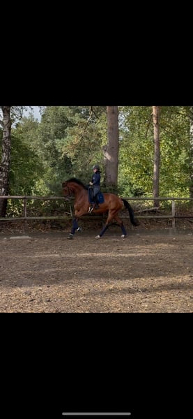 5-year-old gelding by Fusionist x Lauries Crusador This great 5-year-old gelding is looking for a new home. He is approximately 1.76m tall and is currently at a solid A-level. L-level exercises have already been playfully integrated into his training. "Fussel" wants to continue to be developed, which is why I can well imagine him with an ambitious recreational rider. He is very clear-headed and fearless, as he has already demonstrated at competitions. I am only parting with him due to a lack of time. He is farrier-friendly and loadable, as well as regularly dewormed and vaccinated. We charge €30 for a trial ride, which will of course be deducted from the purchase price. Video available upon request.