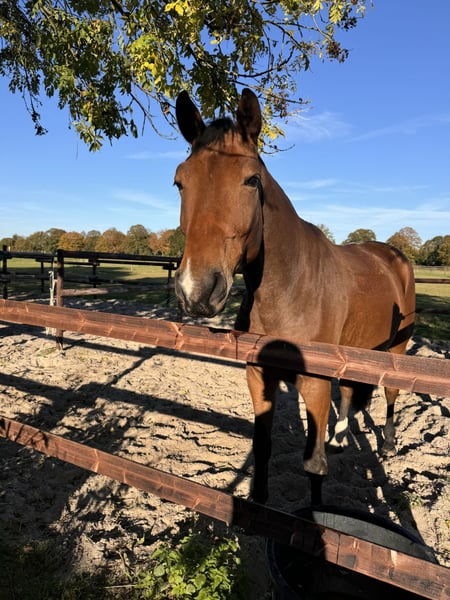 Pour le magnifique et beau Rockefeller -168, nous recherchons d'urgence un foyer aimant. N'hésitez pas à nous appeler directement : 016096798170 Origines : Rock Springs (f. Rockwell x Fidermark) × Fürst Nymphenburg (f. Florencio I x De Niro) En raison de ma grossesse, nous avons décidé de confier Rocky à des mains bienveillantes. C'est un véritable trésor – courageux lors des balades, aimant la compagnie d'autres chevaux, recherchant la proximité humaine et souhaitant encore vivre de nombreuses aventures. Actuellement, il est monté en selle western et a été en pension pendant deux mois, car je ne peux plus monter moi-même. Il peut tout aussi bien être monté en dressage. Il n'existe pas d'autres vidéos de lui. Son niveau de dressage comprend le pas, le trot et le galop. C'est un cheval uniquement de loisir ! Rocky souffre de PSSM2/MIM px/px, il est donc vendu comme cheval de loisir. Il ne présente aucune restriction ni besoin médical – grâce à une gestion adaptée (alimentation, hébergement et couverture), il est en parfaite santé et en pleine forme. Sa magnifique lignée se reflète dans son pas ample et son galop puissant. Il est totalement intrépide en terrain varié, curieux, motivé et connaît aussi bien le travail aux barres, les petits sauts que des exercices de détente. Rocky est ferré et se laisse charger sans problème. Nous cherchons quelqu’un qui souhaite un partenaire pour la vie – une personne qui lui offrira du temps, de la confiance et de la variété. Rocky te suivra dans les bons comme dans les mauvais moments. Merci de ne pas contacter des débutants – il a besoin de quelqu’un expérimenté, capable de comprendre son caractère sensible. Priorité au bon foyer plutôt qu’au prix ! Localisation : près de Cologne - Kerpen Visite possible sur rendez-vous