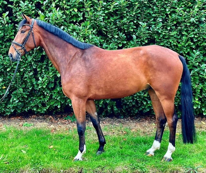 Zum Verkauf steht ein 5-jähriger Wallach von Ogano Sitte/Embassy/Singular Joter. Er hat ein Stockmaß von 1,79 m. Olympic Sitte überzeugt mit seiner enormen Spungqualität und seinem Vermögen. Er ist immer motiviert und geht immer mutig an neue Aufgaben heran. Er wurde schonend 4-jährig angeritten und hat die ersten Turniereerfahrungen gesammelt. 5-jährig hat er nun Springpferde A und L mit Noten bis zu 8,5 gewonnen. Nicht nur sportlich weiß Olympic zu überzeugen, denn er ist im Umgang und beim Reiten ein wahrer Kumpel. Er ist immer brav und motiviert. Auch ein schwächere Reiter ist für ihn kein Problem. Trotz seiner Größe ist er sehr leichtrittig. Im Gelände ist er ebenfalls brav, egal ob alleine oder in der Gruppe. Aufgrund seiner Größe und seinen ruhigen, ausgeglichen Charakter könnten er sicherlich auch ein tolles Voltigierpferd sein. Ein guter TÜV von 2023 liegt vor.