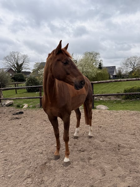 For our beautiful dark chestnut Bruno, we are looking for a loving companion home. Bruno is an absolutely lovable gelding. He is very easy to keep, gets along excellently with any herd, and tends to settle into a lower rank – making him a straightforward herd mate who doesn’t cause any trouble. Due to a serious condition in his deep flexor tendon and bilateral spavin, Bruno can no longer be ridden and is therefore being offered solely as a companion horse. We wish for him a caring new home where he can ideally spend most of his time on pasture, surrounded by good company and people who truly appreciate him. If you are genuinely interested, we look forward to hearing from you. A care contract will of course be provided.