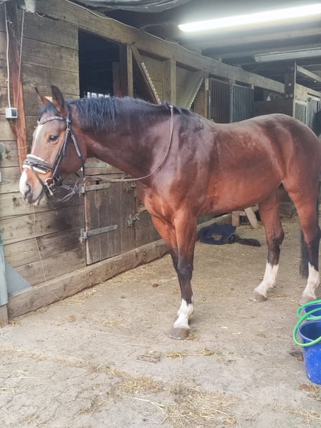 Schicker 9 jähriger Wallach! Lieb und verschmust im Umgang, absolut korrekt und gerade auf den Beinen. Wir haben ihn seid Fohlen an und er war noch nie lahm oder krank! Wenig gefördert, war dieses Jahr das erste Jahr auf Turnier und ist A Gelände gelaufen und A Dressur. Er springt alles, inklusive offenem Wasser etc. und ist im Gelände auch absolut mutig. Aktuelle Röntgenbilder lassen wir jetzt nochmal machen- 2 Jährig war alles absolut top! Er hat viel Go und Drive und ist nicht für Reitanfänger geeignet. Kein Bocker, nur mit viel Bewegungsdrang ausgestattet. Er ist nicht glotzig, lässt sich problemlos Stollen reindrehen und ist ein sehr personenbezogenes Pferd