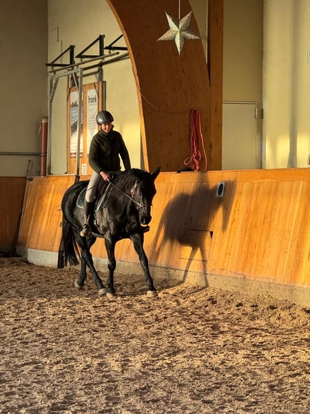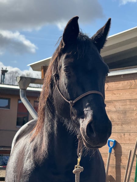 Schweren Herzens verkaufen wir unsere 10 jährige Hannoveranerstute von Schwarzgold x Don Frederico. Ihr Stockmaß beträgt 1,60. In der Vergangenheit hat sie drei Fohlen bekommen. Aktuell ist sie zum Anreiten bei Lisanne Hähndel. Im Training dort zeigt sie sich motiviert und mit ordentlich „Go“. Sie bringt alles mit, was man sich von einer zukünftigen Partnerin wünscht. Gleichzeitig ist sie sehr menschenbezogen, liebt ausgiebige Kuscheleinheiten und möchte ihrem Menschen einfach gefallen. Sie zeigt sich dort sehr lernwillig, aufmerksam und mit großem Potenzial für ihre weitere Ausbildung. Sie arbeitet motiviert mit und bringt viel Herz sowie eine positive Arbeitseinstellung mit. Aufgrund ihrer Sensibilität sucht sie eine liebevolle, aber konsequente Führung durch eine erfahrene Bezugsperson, die ihr Sicherheit gibt und sie fair weiter ausbildet. Bei passender Förderung entwickelt sie sich zu einer tollen Partnerin mit feinem Charakter. Eine Stute mit ganz viel Herz, die mit ihrem Menschen eng verbunden sein möchte. Im Januar/Februar 2026 war der Zahnarzt und die Osteopathin da. Reitvideos sind vorhanden und können auf Anfrage verschickt werden.