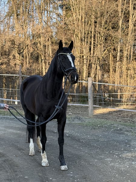 Expressive Hanoverian mare for sale. She has foaled three healthy foals so far, all of which were quickly accepted. Her pregnancies and deliveries have always been smooth and trouble-free.