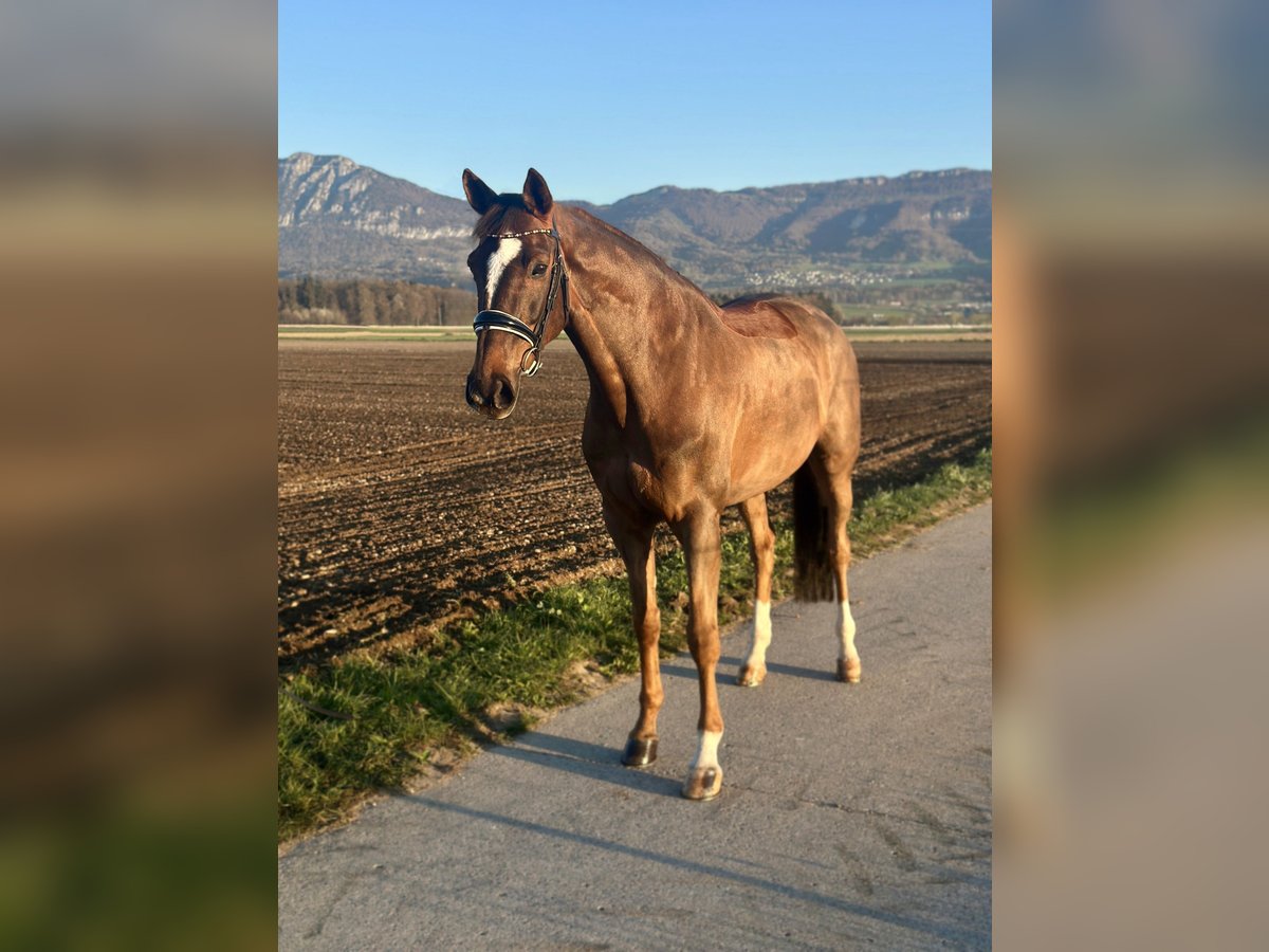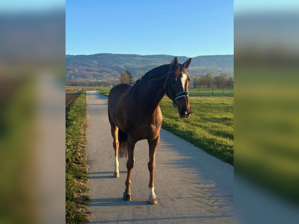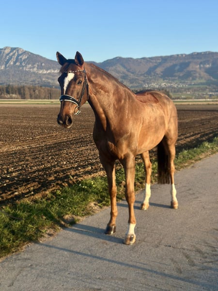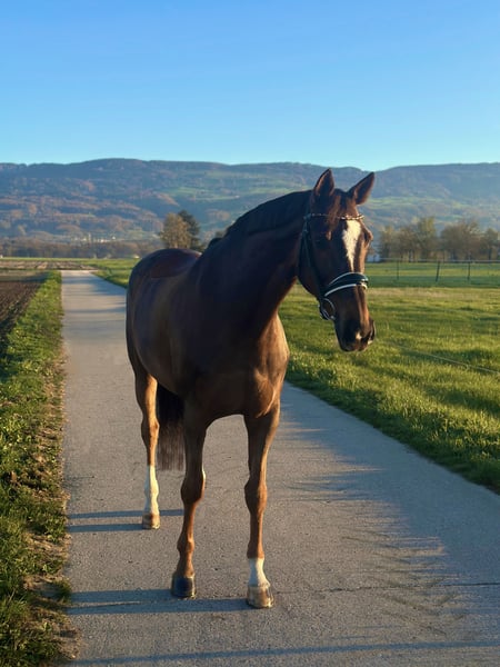 This dark chestnut mare will dispel all stubborn "chestnut mare stereotypes" once and for all! She is impeccably mannered and particularly calm when tacking up. No squealing or sassy behavior towards other horses. And most importantly, she has zero tension or "pissiness" at the leg. Her gaits are all of excellent quality and she is sure to master all exercises up to class L. A horse with enough go that can be ridden without spurs or whip. Especially great for solo or group rides in the terrain. A horse that is always 100% focused and eager to please! Ideally suited for riders with some competition experience, for example, those looking for a licensed horse and aiming to progress towards class L.