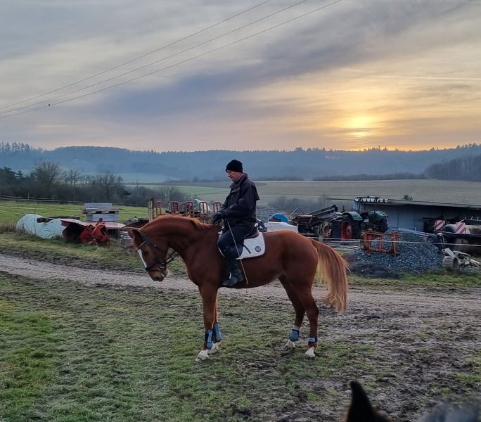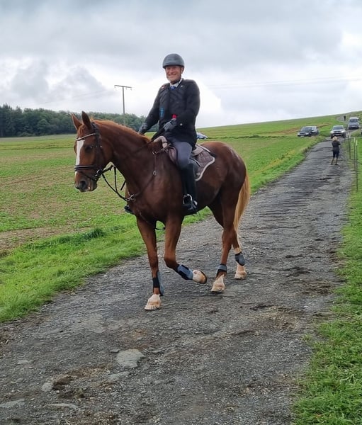 Our mare is honest, well-behaved, and easy to ride for most riders, but she is not suitable as a beginner's horse. Due to an issue with both front legs, she is limited in demanding dressage work or jumping training. She has been trained up to L-level dressage, and has achieved placements in A-Dressage. She has also been ridden up to A-level in jumping. She truly enjoys cross-country riding – whether alone or in a group, she remains calm and reliable. She also loves ground work. In handling, she is a truly trustworthy partner: very affectionate and human-oriented, she is uncomplicated when it comes to shoeing and loading, making daily handling easy. We are looking for a loving home for her with a family environment, where she can have plenty of turnout and be appreciated as a leisure and trail horse.