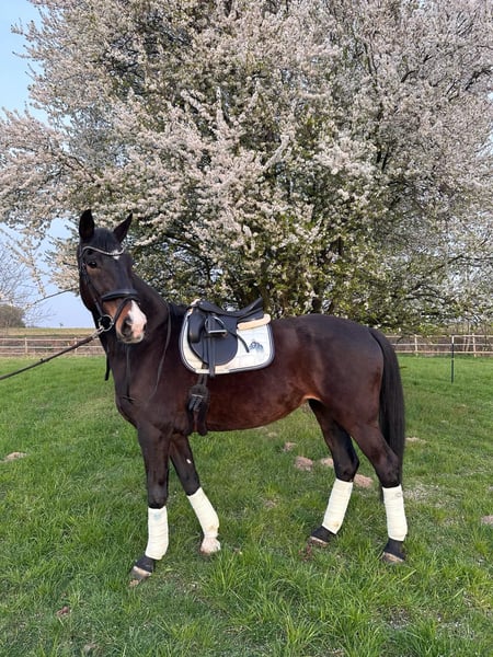 ✨ Hannoveraner Stute – 13 Jahre – ca. 1,72 m groß✨ Diese elegante Hannoveraner Stute sucht ein neues Zuhause. Sie wurde 4 jährig angeritten, bekam dann zwei Fohlen. Zähne wurden im Dezember frisch gemacht und ist regelmäßig beim Hufschmied, sie steht Barhuf. Charakter & Umgang Die Stute ist im täglichen Umgang sehr artig, freundlich und unkompliziert. Sie kennt Hunde, Anhängerfahrten, Hufschmied, Tierarzt sowie landwirtschaftliche Fahrzeuge wie Traktoren. Ausbildung & Reiten Unter dem Sattel zeigt sie sich motiviert, lernbereit und ist flott unterwegs. Sie verfügt über ordentliche Grundgänge und könnte mit einem erfahrenen, sicheren Reiter perspektivisch auch auf Turnieren starten – Turniererfahrung hat sie bisher jedoch nicht. Aktuell ist sie in Beritt und kann dort probe geritten werden. Wichtig: Sie ist nicht für Anfänger oder Wiedereinsteiger geeignet, da sie klare, ruhige Führung und Sicherheit vom Reiter benötigt. Geeignet für Reiter, die Spaß daran haben, ein gut veranlagtes Pferd weiter auszubilden und eine zuverlässige Partnerschaft aufzubauen. Bei Interesse oder weiteren Fragen freuen wir uns über eine Nachricht! Videos und weitere Fotos können bei Interesse verschickt werden