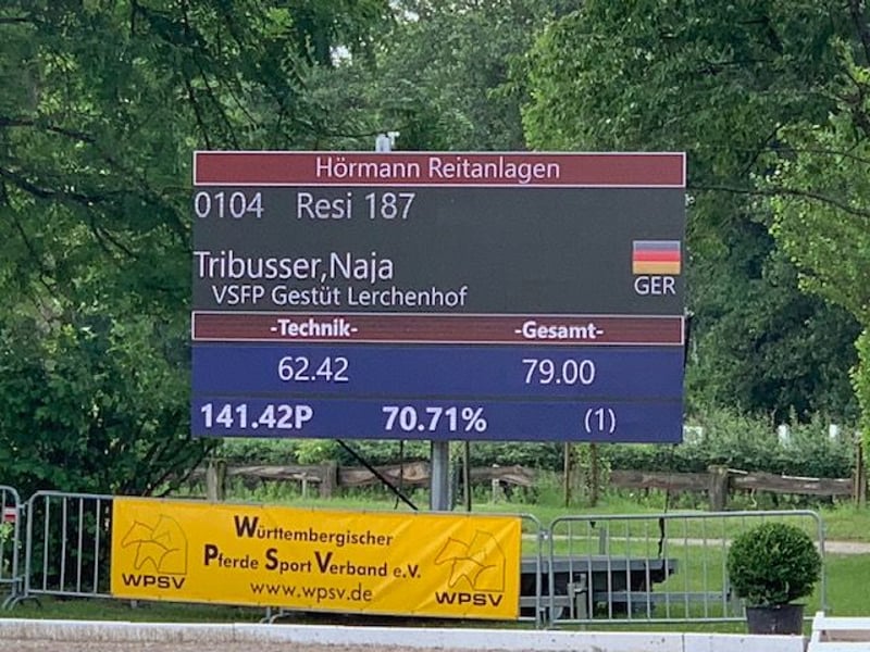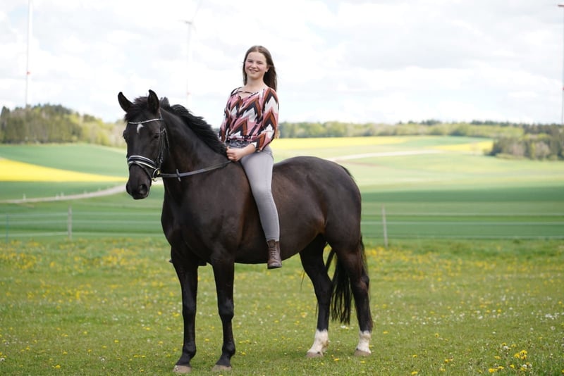 Resi, eine wunderschöne Hannoveranerin in schwarzer Jacke, kam vor 6 Jahren zu mir. Damals war ich 11 Jahr alt und sofort schockverliebt in diese tollen Maus. Resi ist eine sehr motivierte, feine Stute, die immer alles Recht machen möchte. Schnell haben wir uns aneinander gewöhnt und sind auf unseren ersten Turnieren gestartet. 2020 haben wir E-Dressur mit 9,3 gewonnen, darauf folgten mehrere A-Platzierungen. 2021 sind wir sehr erfolgreich auf A-Niveau unterwegs gewesen, sammelten unsere ersten Erfahrungen in L-Dressur. Bei den Baden-Württembergischen Meisterschaften in Meißenheim errieten wir uns den 4. Platz. 2022 bin ich mit Resi nur noch wenig auf dem Turnier gewesen, da ich da schon andere Pferde zu Reiten hatte. Aufgrund Ihrer sehr guten Abstammung (direkte Rotspon Tochter), haben wir 2023 angefangen mit Ihr zu züchten. 2024 hat Resi uns eine wunderschöne Tochter von "Rock for me" geschenkt und letztes Jahr (2025) hatte sie einen wunderschönen Hengst von "Diamantenglanz" bei Fuß. Resi hat immer beim ersten besamen aufgenommen und die Geburten verliefen ohne Komplikationen. Sie war immer eine fürsorgliche und liebevolle Mutter. Aufgrund einer leichten Fehlstellung in den Vorderbeinen wollen wir sie an einen ambitionierten Freizeitreiter, der Spaß an der feinen Arbeit mit einem tollen Pferd hat, gerne ins Gelände geht und Zeit mit dem Pferd verbringt. Seid Oktober arbeite ich wieder mit Ihr, sie hat auch schon einige Runden mit unseren Reitschülern gedreht, da sie aber ein sehr fein an der Hand zu reitendes Pferd ist, kommt sie mit Reitanfängern nicht so gut klar. Sie kennt Stangenarbeit und Cavaletti Training, geht gerne ins Gelände und ist auch bei der Bodenarbeit motiviert dabei. Resi war im Dezember 2025 beim Zahnarzt und beim Chiropraktiker. Sie ist vollständig, turniermäßig, geimpft, wurde immer regelmäßig entwurmt und den Schmied hat sie auch immer alle 6-8 Wochen gesehen. Sie lebt bei uns in einer Stutenherde mit täglichem Auslauf auf der Weide oder auf dem Paddock, nachts in der Box. Während sie Fohlen bei Fuß hatte, lebte sie in der Zuchtherde im Offenstall oder 24/7 auf der Weide. Natürlich wünschen wir uns ein 10* Zuhause für sie, wichtig ist mir, das sie einen Menschen hat, der für sie da ist und sich Zeit für sie nimmt. Sie braucht eine artgerechte Haltung und genügend Auslauf an der frischen Luft mit Artgenossen. Aufgrund Ihrer Größe ist sie kein Gewichtsträger, braucht aber einen feinen Reiter, der schon unabhängig mit der Hand ist. Sie hat noch nie irgendwelche Schweinereien, wie bocken oder steigen gezeigt, hat auch keine "Hobbies". Für ein Kennenlernen mit Probe Reiten wird eine Gebühr in Höhe von 25 Euro in bar fällig.