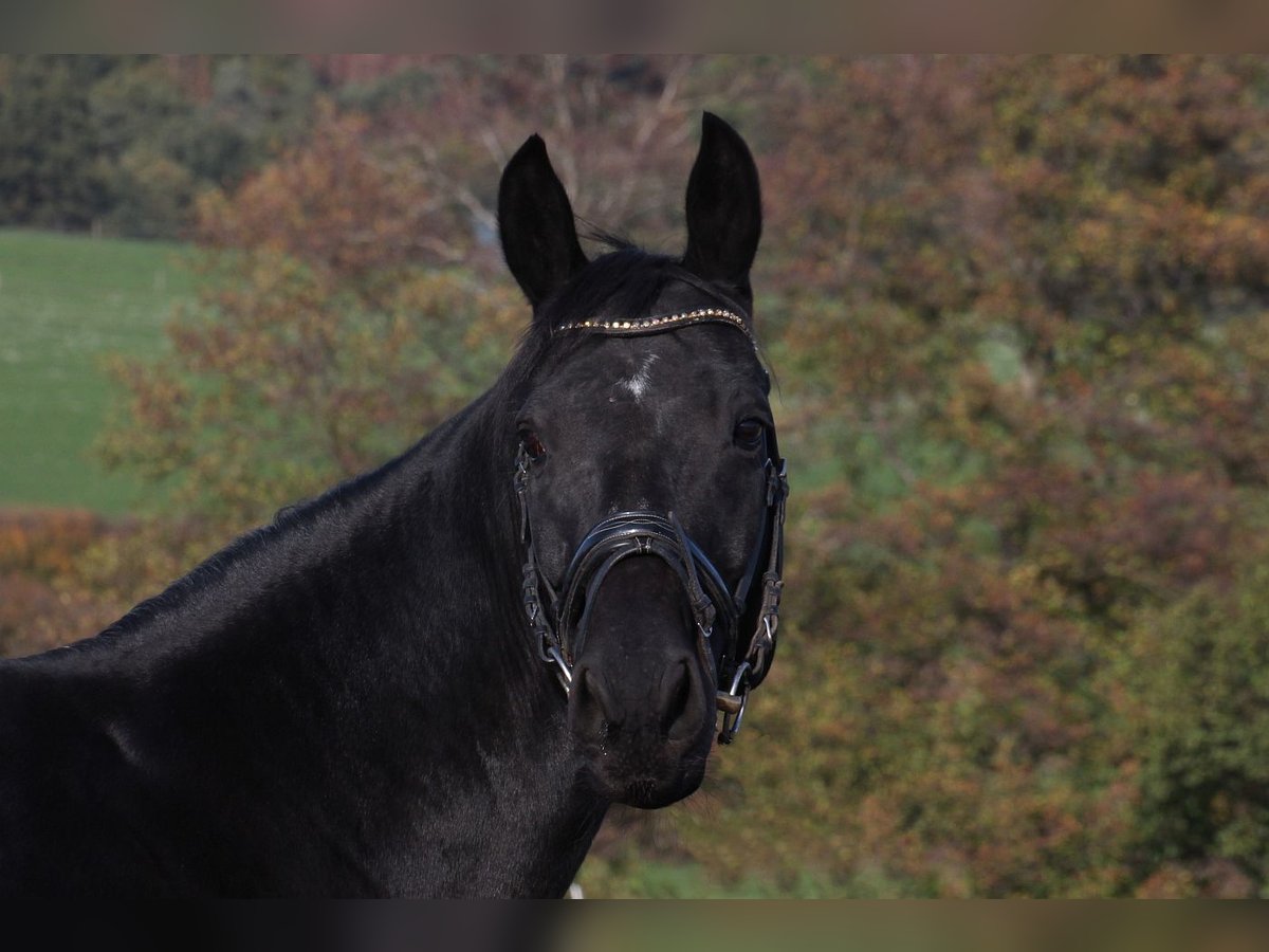 Visit us and get to know Ruby Dawn - the black advanced (S) level pearl! This easy to ride mare with three very good basic gaits and a height of 1.66 m is now trained up to advanced dressage level and has everything a rider's heart desires. Unfortunately, she was usually very tense at competitions, which is why we didn't show her much, but she recently placed second in a medium (M) level dressage test**. Whether for the cautious rider who would like to ride challenging lessons or the demanding leisure rider in cross-country - Ruby Dawn is the perfect partner. When handling and riding, she is always clear-minded, trustworthy and easy to handle. She is also easy to forge and load. Let Ruby Dawn's talent and character convince you. Ruby Dawn is looking forward to a new home where she will continue to be supported and loved.