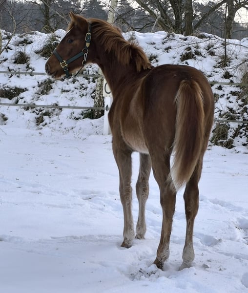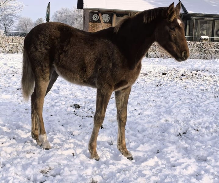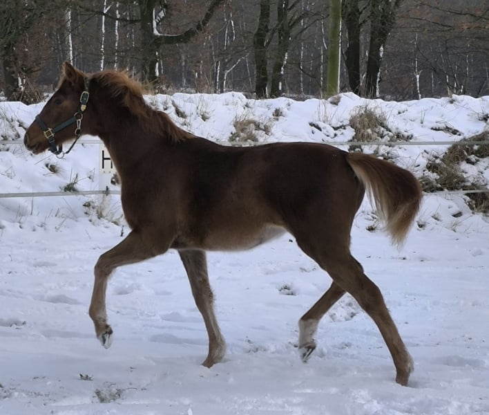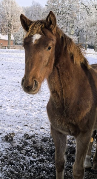 Intelligent, people-oriented, and strong-charactered chestnut filly with a good foundation and powerful movement. About her father, the State Stud Celle writes: Vidar, Viscount – Edward – Contendro – Espri: a pedigree that perfectly symbolizes dual talent. Style and ability in jumping combined with three excellent basic gaits make Vidar a perfect all-rounder, also striking in type and generous in frame: You cannot overlook Vidar! The dam's sire, Floris Prince, achieved a fantastic stallion performance test in Adelheidsdorf. With the second-highest breeding value in dressage of 143, he received a score of 9.0 for his elasticity in trot and his enormous rideability. The test riders were also thrilled with his riding comfort and awarded top scores. Furthermore, the dam's lineage from Don Vino (Donnerhall x Consul (Trak.) and then Brentano x Weingau leaves nothing to be desired. This appealing young lady has daily human contact and grows up in a herd environment with plenty of fresh air. A pleasantly uncomplicated foal. Born on April 11, 2025.