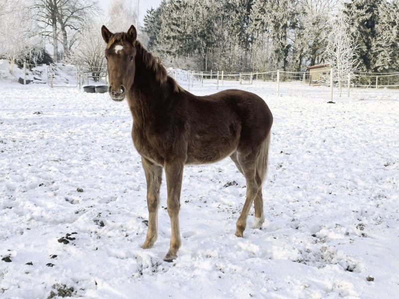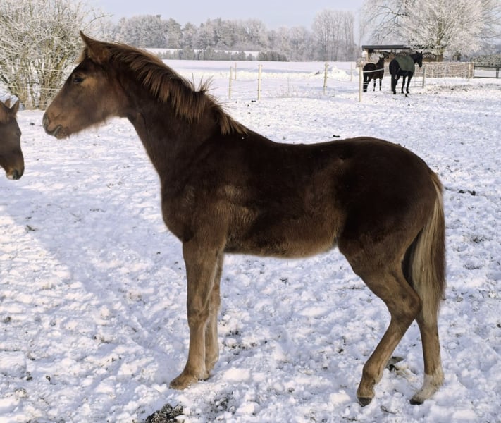 Schickes und menschenbezogenes Dunkelfuchs-Stutfohlen mit sehr gutem Fundament und starkem Antritt ausgestattet. Dieses ansprechende Fräulein hat täglichen Menschenkontakt und wächst im Herdenverband mit viel frischer Luft auf. Sie beherrscht das Fohlen-ABC. Geboren am 11.04.2025. Über ihren Vater schreibt das Landgestüt Celle: Vidar, Viscount – Edward – Contendro – Espri: ein Pedigree welches in Vollendung Doppelveranlagung symbolisiert. Manier und Vermögen am Sprung gepaart mit drei hervorragenden Grundgangarten all‘ dies macht Vidar zu einem Allrounder in Perfektion, dazu bestechend im Typ und großzügig im Rahmen: An Vidar kann man nicht vorbeischauen! Der Muttervater Floris Prince legte eine fantastische Hengstleistungsprüfung in Adelheidsdorf ab. Mit dem zweithöchsten Zuchtwert Dressur von 143 bekam er die Note 9,0 für seine Elastizität im Trab und für seine enorme Rittigkeit. Auch die Testreiter waren von seinem Reitkomfort begeistert und vergaben Höchstnoten. Die weitere Abstammung der Mutter von Don Vino (Donnerhall x Consul (Trak.) und Brentano x Weingau lässt ebenfalls keine Wünsche offen. Diese Kleine verspricht eine Große werden zu wollen. Das zu erwartende EM wird ca. 170cm betragen.