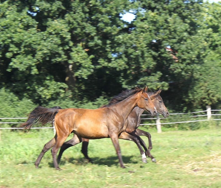 Quäntchen Glück, ist eine typvolle bewegungsfreudige junge Stute mit freundlichem und menschenzugewandtem Charakter. Vater Quintessential wurde 3-jährig Hengstleistungssieger, Landesvizechampion und Bundeschampionatsteilnehmer, auch Großvater Danone II vererbt mit Donnerhall / Weltmeyer bestes Dressurblut, im mütterlihem Pedigree ist über Marlesko xx und Adler Ausdauer und Springveranlagung zu verzeichnen. Somit ist sie doppelt veranlagt und bringt alles mit für ein Freizeitpferd , aber auch erfolgreiches Turnierpferd in Dressur und Vielseitigkeit. Direkt vom Züchter