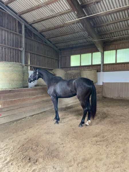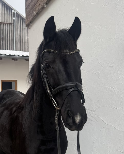 Zum Verkauf steht diese 3-jährige Rappstute namens Diva mit einem Stockmaß von etwa 166cm. Sie besitzt einen herzensguten Charakter und möchte gefallen. Beim anreiten zeigte sie sich brav und gelehrig, benötigt jedoch gewisses Einfühlsamkeitsvermögen und eine unabhängige Reiterhand. Da sie voll im Wachstum steht, wurde sie nach dem Anreiten nochmal in die Koppelpause geschickt. Aufgrund des sehr feinen Typ's eignet sie sich bei weiterer Ausbildung gut als Damenpferd, jedoch nicht als Gewichtsträger. Im Laufe des Sommers hat die Stute etwas sensibel auf Kribbelmücken reagiert, daraufhin wurde eine Blutuntersuchung durchgeführt und ein Zinkmangel festgestellt. Dieser Mangel kann über entsprechendes Zusatzfutter ausgeglichen und reguliert werden. Die Stute steht derzeit in 94227 Zwiesel. Platz vor Preis, kein Notverkauf.