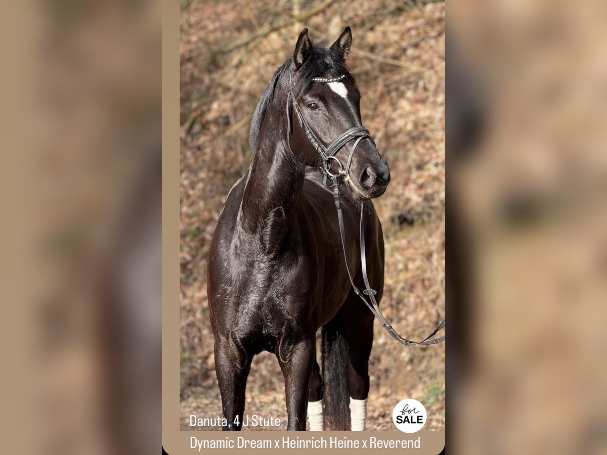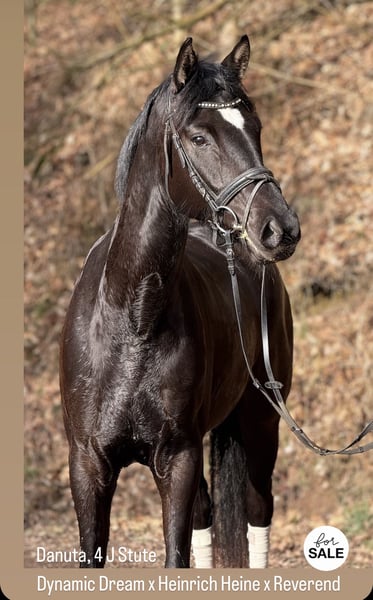 Elegant 4-year-old mare with a wonderful character for sale Danuta is a beautiful 4-year-old mare standing approximately 16.1 hh. She has been lovingly raised and impresses with her gentle, balanced temperament, as well as her high willingness to learn and great talent for dressage. Danuta already has a solid foundation in groundwork and is attentive, well-behaved, and people-oriented in her interactions. She has been backed and is familiar with the initial steps under saddle. She consistently shows cooperation and a desire to please her handler. Her pedigree (Dynamic Dream x Heinrich Heine x Reverend) also provides promising potential for dressage, which is reflected in her above-average gaits and rideability. She is a sensitive, friendly mare that, with further development, is sure to realize her full potential. We wish her a loving home where she can continue to be nurtured and trained. For inquiries and further information, please feel free to contact us.