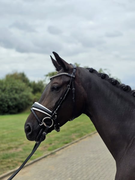 Four-year-old compact young horse with an actively stepping hind leg and a good work ethic. Still fully in development, Norla is recommended for ambitious dressage riders looking for a horse of medium frame. With a height of 166 cm, she is ideally suited as a ladies' horse or for riders who are not too tall, but she also accommodates larger riders well (rider in the video is 190 cm). Norla is light on her legs and easy in the contact, and she is an absolutely honest horse with good forward movement. The riding experience in the canter is particularly noteworthy. Here, she always jumps uphill and far under the center of gravity. Norla has been presented once in a riding horse competition. The first competition experience was uncomplicated in all aspects. A radiographic examination was done when she was two years old.