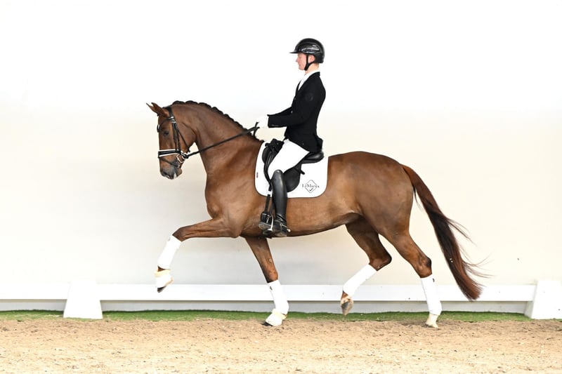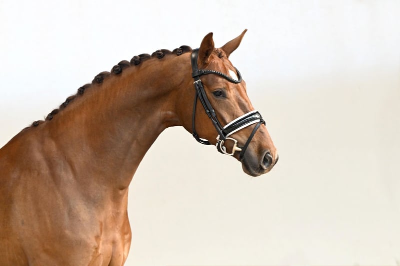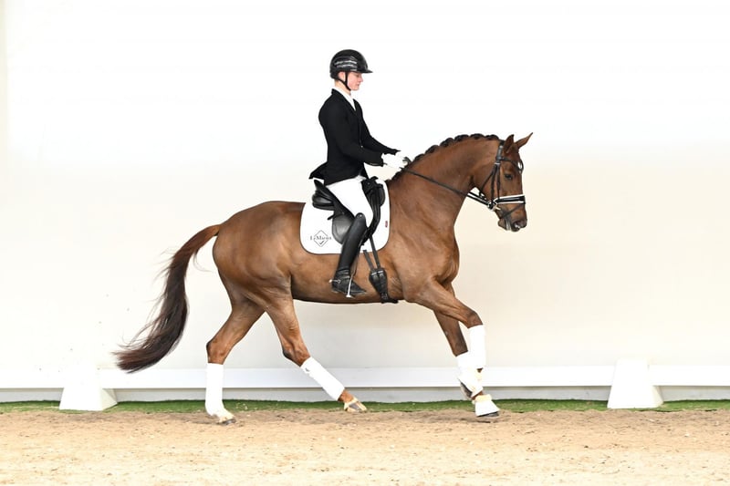 Mirabelle is a five-year-old mare who impresses from the very first moment. She combines exceptional rideability with remarkable athleticism, highlighted by an outstanding natural trot that shines even in the extended paces. Her conformation is beautiful and correct, complemented by brilliance, charm, and an exceptionally fine presence – a horse that delights both in the arena and during training. A Pedigree That Inspires Confidence: Her sire, My Vitality, the younger full brother of the proven stallion Vitalis, is among the most promising young stallions. With his elegance and exceptional basic gaits, he impresses on every level – already in 2020, he completed his 35-day performance test with an outstanding 902.5 points. Her damsire, Bon Bravour, brings an exceptional sport and stallion career to the pedigree: modern, long-legged, and endowed with three top-quality basic gaits, he has celebrated numerous international successes. Among other achievements, he won the 4- and 5-year-old stallion competitions in Hengelo and Roosendaal, placed at the World Championships for Young Dressage Horses in Verden, and claimed the “Pokal von Belgien.” His elasticity, rhythm, and extraordinary rideability make him a sire of the highest quality. The maternal grandsire, Rubin Royal OLD, excelled himself at Grand Prix level and ranked among the ten best dressage sires in the world according to the WBFSH rankings. In 2017 and 2018, he even achieved second place worldwide. Mirabelle brings together everything a young dressage horse should offer: outstanding basic gaits, exceptional rideability, charm, and a proven, top-quality pedigree. She is a mare for riders with the highest expectations – equally suited for advancing through higher-level movements or pursuing a successful competition career.