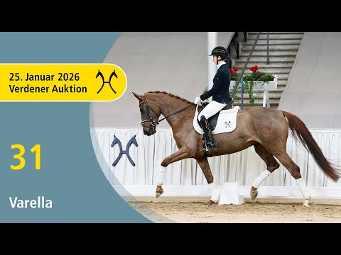 Mit interessant abgestimmtem Pedigree stellt sich Varella als ein sich fein bewegendes Dressurpferd dar. Sie ist mit der Hannoveraner Prämienanwartschaft ausgezeichnet, 1a prämiert anlässlich der Stutenschau in Tarmstedt, die sie als Klassensiegerin verließ. Ihre Großmutter StPr Liebelei ist Mutter des gekörten Hengstes Ferguson v. Floriscount, deren Vollbruder mit Nele Lübbehusen siegreich in S-Dressuren ist. Zuchtprämie: 1xIa. Leistungsprüfung: Feldprüfung Reitpferd - Trab 8,00 Galopp 7,50 Schritt 8,50 / Durchschnitt Rittigkeit 8,50 / Durchschnitt Springen 0,00 Prämie: HannPrA 2. Generation Sportpferde Dressur: Ferguson 9 v. Floriscount (DRE: S mit Nele Lübbehusen); La Bonita/La Bonita 80 v. Livaldon (DRE: M** mit Alvaro Osborne Diez). gekörte Hengste: gek. Hengst Ferguson/v. Floriscount v. Floriscount (Verden 2013,FoVA 2011: 24.000 €,HM 2013: 80.000 €,Prä.Dre. Körung Verden 2013). Auktionspferde: Vitória v. Vitalis (FoVA 2022); Samsonite v. Secret (FoVA 2020: 39.000 €). Bes. Prämientöchter: HannPrA Bohemian Rhapsody/Bohemian Rhapsody 11 v. Bon Vivaldi NRW (Herwart von der Decken-Schau Verden 2024); HannPrA Diva/Dollar Girl 70 v. Donier; HannPrA Fantastic Dream/Fantastic Dream 18 v. Feinrich; HannPr Flipflop/Flip Flop 15 v. Floriscount (Herwart von der Decken-Schau Verden 2015); StPrA Davina v. Davignon I. 3. Generation Sportpferde Dressur: StPr Rock'n Rose EMH/EMH Rock'n Rose FBW v. Rock my Soul (DRE: S* mit Anna-Lisa Schepper,Finalteilnehmer Bundeschampionat 4j.Reitpferde 2020,Bundeschampionat f. Reitpferde 2020); HannPrA Quinada/Quinada 2 v. Quasar de Charry (DRE: S* mit Jörn Kubelke); Roberto Cavalli 5 v. Riverside (DRE: S* mit Hannes Baumgart,VA 2009); gek. Hengst Big Shelby/Shelby 15 v. Sir Donnerhall I (DRE: M** mit Kathrin Peikert,Kreuth 2013,FoVA 2011); Finest Look v. Fürsten-Look (DRE: M* mit Dominic Bücker,FoVA 2016); Loriot 377 v. Londontime (DRE: M* mit Julia Hiller,FoVA 2008: 25.000 €); Belly Deluxe F.A.H.B. v. Barclay (DRE: M* mit Constanze Möller). Aufbauprüfungen Dressur: gek. Hengst Bienvenue/Bienvenue 10 v. Bon Coeur (DRE: M mit Jan-Dirk Gießelmann,Adelheidsdorf 2021); HannPr Diamanda Dea/Diamanda Dea S v. Dancier (DRE: L,Herwart von der Decken-Schau Verden 2018); Sienna/Sienna 58 v. Sir Donnerhall I (DRE: L,FoVA 2012). Auktionspferde: Springtime de Montligeon/Shape of you v. Secret Escape (FoVA 2025); Sigi v. Secret Escape (FoVA 2024); Braveheart v. Bonds (FoVA 2023); Vet+ Infinity/Infinity 62 v. In My Mind (VA 2025: 110.000 €,FoVA 2021); v. Dynamic Dream - v. Dynamic Dream (VA 2023); Vet+ Somersby K/Sommersby 32 v. Secret (VA 2024); Sunday Rose v. Sir Donnerhall I (VA 2022); v. Dancier v. Dancier (VA 2018); Fine Star/Fendi v. Finest (FoVA 2015); Brandon v. Bretton Woods (VA 2016); Lifetime v. Londontime (FoVA 2010: 16.000 €). Bes. Prämientöchter: HannPrA Valerie v. Von Und Zu; HannPrA Siebenschön/Siebenschön 4 v. Sir Donnerhall I; HannPr Bonita M v. Benicio; HannPr Diana v. Desiderio; HannPr Delarenta v. Dimaggio; StPr Luciana v. Lauries Crusador (Reservesiegerin Herwart von der Decken-Schau Verden 2012); StPr Dancia v. Dancier; StPr Rosalie/Rosalie 131 v. Rotspon; StPr Hexe v. His Highness; StPr Liebelei v. Lauries Crusador. 4. Generation Sportpferde Dressur: Wondrous Fox v. Wolkentanz (DRE: Grand Prix mit Birgid Schenk,Dressurprüfung Kl. S*** - Grand Prix de Dressage 2009). Sportpferde Springen: StPr LS-S Aggi/Aggi B.B v. Arpeggio (SPR: 1,40 m mit Sabine Trippe); Connery 21 v. Contendro I (SPR: 1,35 m mit Kassandra Mohr). Aufbauprüfungen Dressur: gek. Hengst Emiliano/Emiliano 13 v. Escamillo (DRE: L,Greven 2023); VbPr Bluebell Star v. Borsalino (DRE: L). gekörte Hengste: gek. Hengst Entertainer Number One v. Escamillo (Hoftermin 2022). Auktionspferde: Weekend Feeling v. Worldly (VA 2006). Bes. Prämientöchter: StPr Lumana v. Likoto; StPr Gala/Gala 101 v. Golfclub. 5. Generation Sportpferde Dressur: Enya electric v. Espri (DRE: M** mit Julia Kistner). Sportpferde Springen: gek. Hengst Coeur d'Amour/Coeur d' Amour v. Conteur (SPR: int. 1,30 m mit Denise Spörri,Verden 2006,VA 2009,HM 2006); Dwayne the Rock Johnson/Dwayne the Rock Johnson 3 v. Diacontinus (SPR: 1,40 m mit Birka Antonia Moritz); Rascudo v. Rascalino (SPR: 1,35 m mit Mariam Kienz); Cassina K v. Cassini II (SPR: 1,35 m mit Anja-Sabrina Heinsohn,VA 2016); For Fantasy 12 v. Fairbanks (SPR: 1,30 m mit Pia Pelters); Sir Hook v. Sambuco Junior (SPR: 1,30 m mit Lutz Besecke); Liostro's Son v. Liostro (SPR: M mit Marcel Neukirch). Aufbauprüfungen Dressur: Fireball 50 v. Floris Prince (DRE: L). Aufbauprüfungen Springen: Cerano 8 v. Carolus I (SPR: M mit Carstens,Bernd); Camisso v. Carolus I (SPR: L); Dior 71 v. Dakar (SPR: L). Auktionspferde: De Luxe v. Dakar (VA 1988). Bes. Prämientöchter: StPr Carluccia v. Carlucci; StPr Emma Peel K. v. Escudo II; StPr Danja v. Dakar. Mutter: Doswidanja Prämierung: 1xIa. ZL: 6/5 ZSP: Feldprüfung Reitpferd - Trab 7,50 Galopp 7,50 Schritt 8,00 / Durchschnitt Rittigkeit 8,00 / Durchschnitt Springen 6,50 Großmutter: Liebelei Prämierung: 2xIa. ZL: 16/11 ZSP: Feldprüfung Reitpferd - Trab 8,50 Galopp 8,50 Schritt 8,00 / Durchschnitt Rittigkeit 9,25 / Durchschnitt Springen 6,25 Das Pferd ist ein Verdener Auktionspferd und wird am 25.01.2026 online versteigert. Vom 12.01. bis zum 25.01. kann das Pferd jeden Tag beim öffentlichen Training besichtigt und ausprobiert werden. Das Startgebot bei der Versteigerung ist 8.000 Euro.
