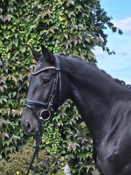 Modern, leggy black mare with three excellent basic gaits and outstanding rideability. She also possesses a truly friendly, people-oriented temperament. We are looking for a supportive and loving new home for this dream horse. A recent TÜV report without findings, including X-rays of the back, is available. In training for three months; the price will increase with further education. If interested, please contact us exclusively by phone or WhatsApp at 01744022800.