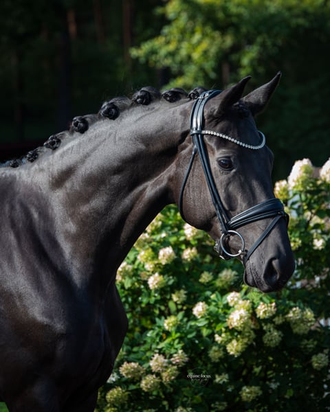 Morricone’s Märchen est une jument hanovrienne charmante et sincère, dotée d’un caractère fin et d’une excellente aptitude au saut. Fille du étalon Morricone et issue d’une mère Don Schufro, elle rassemble deux lignées reconnues pour leur facilité de saut, leur volonté de performer et leur fiabilité. Elle se montre toujours volontaire à l’apprentissage, équilibrée et souple dans sa reprise – un cheval de relève idéal pour les cavaliers attachés à de bonnes qualités de selle et à une tête claire. Morricone’s Märchen a passé sa inspection de performance de jument avec le label « Jument primée d’État ». Elle a obtenu la note de 8,5 dans toutes les allures, ainsi que pour sa souplesse sous le cavalier extérieur – une preuve impressionnante de sa qualité et de son agréable ressenti à l’équitation. Au quotidien, elle se montre parfaitement calme, facile et fiable, aussi bien en box qu’en travail. Elle convient parfaitement aux amateurs ou aux formateurs à la recherche d’un jeune cheval doté de qualités exceptionnelles pour un développement futur optimal.