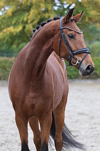 A characterful, beautiful mare with a harmonious conformation and expressive movement. She demonstrates good basic relaxation and impresses with solid training at L-level. Under saddle, she is eager to learn but requires an experienced, sensitive rider to further develop her potential and build trust. A charming horse for riders who enjoy refined dressage work and individual development.