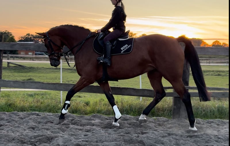 Easy-going mare with excellent pedigree! Due to this, she has been in breeding for the last few years. The last foal was weaned recently, and she is now being retrained. Responsive to aids, very people-oriented, and has a nice jump. As a sport or leisure horse, she can also be covered again by our stallions at any time upon request. Of course, she is healthy, with no known pre-existing conditions or intolerances. A current very good radiographic examination is already available. Video inquiries, etc. are only possible in advance via WhatsApp.