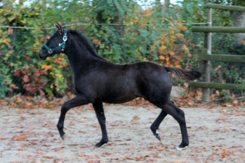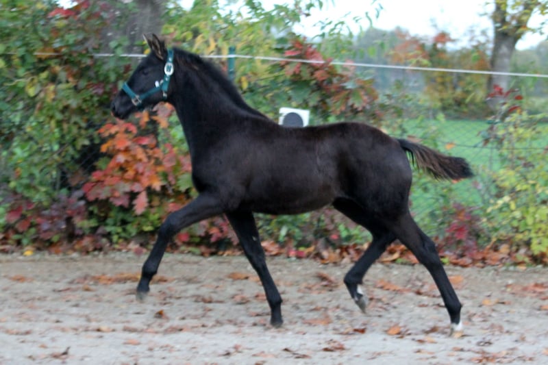 Potro de semental negro azabache en el estilo de su padre Glamdale. Con un gran tipo, un ojo muy bonito y mucha presencia. El padre Glamdale fue, entre otros, un aclamado subcampeón mundial de caballos de doma de cinco años en Ermelo. Con rondas armoniosas, la pareja Glamdale WP NRW y su jinete Steffi Ahlert conquistaron no solo los corazones del público. Los jueces otorgaron notas de ensueño y el mundo celebró una nueva pareja de ensueño en la pista de doma. El padre de Glamdale, Glamourdale, fue nombrado por tercera vez "Caballo de Doma del Año KWPN" y es, bajo la tutela de su entrenadora Charlotte Fry (GBR), ganador de medalla de bronce olímpica en París con el equipo británico y en el programa libre. Recientemente, ambos brillaron con dos victorias (89,84%) en la etapa de la Copa del Mundo en Ámsterdam. La madre de Glamdale, Martinadale P, es la hermana directa de Maracana del Milenio. Maracana, semental premiado de la aprobación de Westfalia, ha llegado ahora a la clase alta. El padre de la madre, Millenium, es uno de los Trakehner más significativos de la cría actual. Con numerosos sementales ganadores y premiados, hijos exitosos en el deporte y 70 hijos aprobados, forma parte del Who's Who de la cría moderna de rendimiento. En la línea materna de este potro negro, siguen dos importantes sementales de la cría de caballos de doma de Hannover: Brentano II y Weltmeyer. Ambos estuvieron durante toda su vida en la estación de cría de Celle y produjeron una serie de caballos de doma internacionalmente exitosos. El potro en sí impresiona con su sustancia seca y correcta. Con un carácter impecable y una actitud amigable hacia los humanos, no hay nada que impida una futura carrera como caballo de deporte exitoso. Video disponible a pedido. Por encargo del criador. Se puede ofrecer un lugar de crianza.