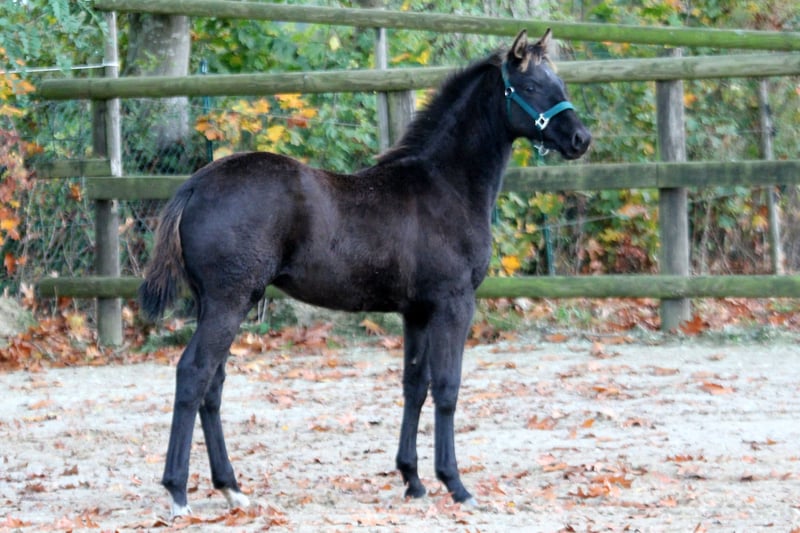 Jet black stallion candidate, very much in the style of his father Glamdale. Typy, with a very beautiful eye and a lot of charisma. Father Glamdale was, among other things, a celebrated Vice-World Champion of five-year-old dressage horses in Ermelo. With harmonious rounds, the pair Glamdale WP NRW and his rider Steffi Ahlert not only captured the hearts of the audience. The judges awarded dream scores, and the world celebrated a new dream pair in the dressage arena. Glamdale's father Glamourdale has been named "KWPN Dressage Horse of the Year" for the third time and is an Olympic bronze medalist in Paris with the British team and in the freestyle under his trainer Charlotte Fry (GBR). Recently, the two shone with two victories (89.84%) at the World Cup stage in Amsterdam. Glamdale's mother Martinadale P is the direct sister of Maracana vom Millenium. Maracana, a premium stallion from the Westphalian licensing, has now reached the heavy class. The maternal grandfather Millenium is one of the most significant Trakehners in current breeding. With numerous winners and premium stallions, successful sport offspring, and 70 licensed sons, he belongs to the who's who of modern performance breeding. In the descending maternal line of this black stallion, two significant sires of Hanoverian dressage horse breeding follow: Brentano II and Weltmeyer. Both were stationed at the State Stud Celle throughout their lives and produced a whole series of internationally successful dressage horses. The foal itself impresses with its dry and correct substance. With a flawless character and a friendly disposition towards humans, nothing stands in the way of a future career as a successful sport horse. Video available upon request. On behalf of the breeder. A place for raising can be provided.