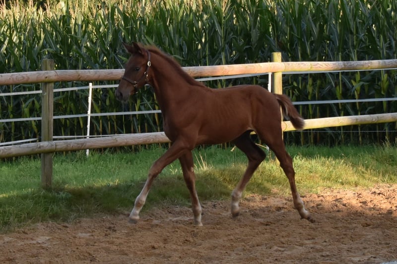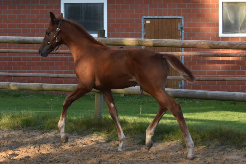 Ein feiner Cocktail der modernen Dressurpferdezucht. Dunkelfuchs-Hengstfohlen mit Dressurpedigree der Extraklasse, geb. am 23.06.2025 von Morricone I aus der St.Pr.St. Dalotta von Don Frederico/Weltmeyer/Brentano, ausgestattet mit drei überzeugenden Grundgangarten, wächst er liebevoll mit Familienanschluss auf. Elegant und langbeinig kommt er daher und kann in Typ und Qualität seinen Vater nicht verleugnen. Interessant für Sport und Zucht, direkt vom Züchter. WFFS negativ. Vater Morricone I war Siegerhengst der Hengstkörung 2014 in Oldenburg und legte seine Hengstleistungsprüfung mit dressurbetonter Endnote von 9,33 ab. Sportlich ist er hoch erfolgreich unter Moritz Treffinger. Ebenso machen seine Nachkommen inzwischen auf Turnieren bzw. Championaten, Körungen, Stutenschauen und als Preisspitzen auf Auktionen auf sich aufmerksam. Die Mutter nimmt am Programm Hannoveraner Dressurpferdezucht (PHD*) teil. Ihr hannoversches Dressurpedigree spricht ebenfalls für sich. Die Vollschwester von Mojito war 2023 Klassensiegerin der Stutenschau in Coesfeld-Lette und kann bei Interesse besichtigt werden. Überzeugen Sie sich am besten persönlich von der Qualität dieses kleinen Youngsters.