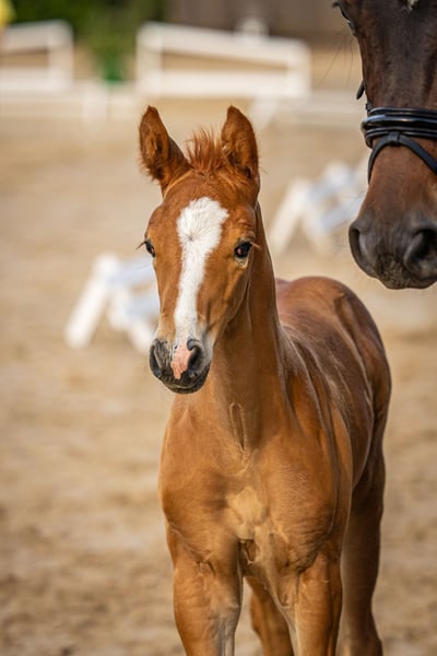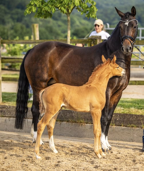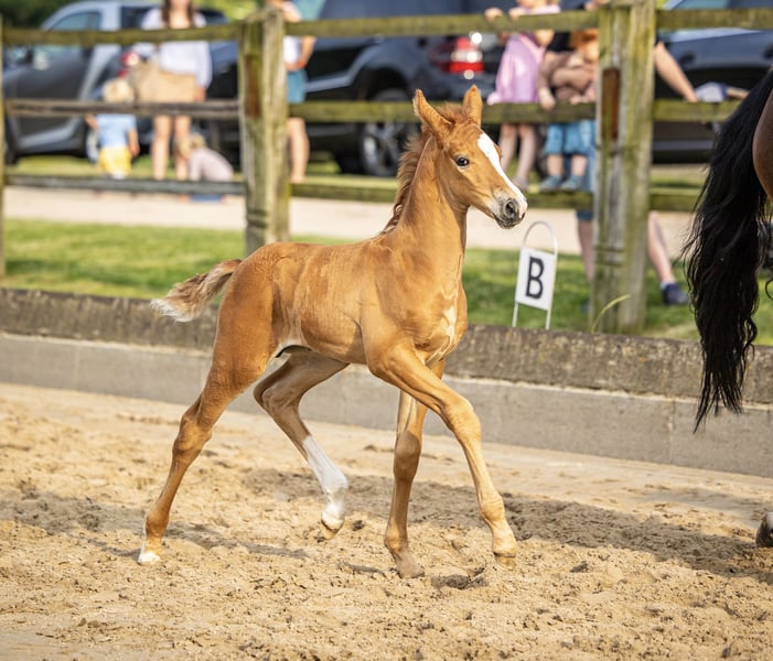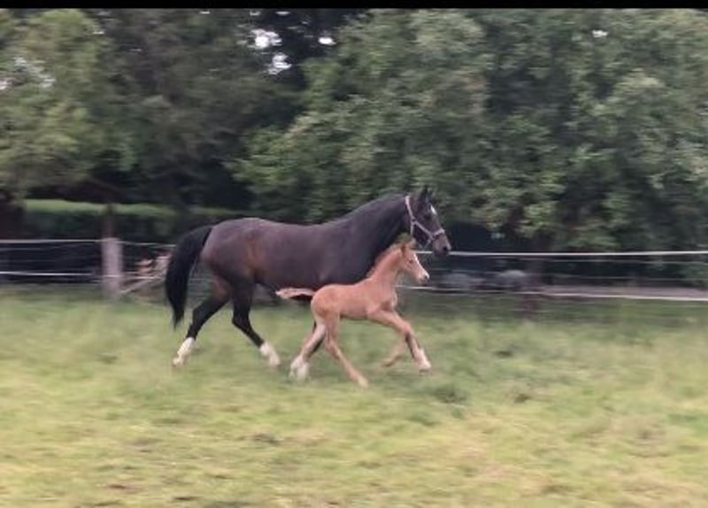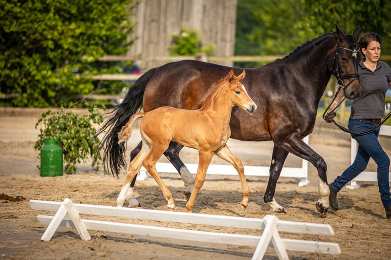 Hübsches Hengstfohlen von Endorphin mit Top-Genetik Zu verkaufen ist ein sehr hübsches Hengstfohlen, Fuchs (wird vermutlich Dunkelfuchs), am 02.06.25 geboren von Endorphin aus einer Stute von Belantis/ Riccione. „Emil“ ist ein deutlich im Hengsttyp stehendes Fohlen mit sehr korrektem Fundament, tollen Grundgangarten und einem top Pedigree. Endorphin (Escolar x Don Nobless), der aktuell 3. Platzierte der Weltmeisterschaft der jungen Dressurpferde und zweimaliger Vize-Bundeschampion unter Greta Heemsoth wurde angepaart an eine Stute von Belantis I, seinerzeit Bundeschampion und Vizeweltmeister, zudem ein Vertreter der berühmten Neustädter P-Familie. Die Mutterstute selbst ist bis Dressurpferde-L platziert, sehr rittig und kopfklar. Sie ist mit sehr guten Noten eingetragen, u.a. einer 9,0 für den Schritt! Die Mutterstute hat einwandfreie Röntgenbilder inkl. Hals! „Emil“ ist ein sehr freundliches, neugieriges, selbstbewusstes und unerschrockenes Fohlen, dass sich einwandfrei am Halfter führen lässt, es genießt geputzt zu werden und brav alle Hufe gibt. Er wurde selbstverständlich regelmäßig entwurmt, war beim Hufschmied und kann auf Wunsch vor dem Absetzen seine 1. Impfung bekommen. Er stammt aus einer kleinen privaten Zucht und wächst artgerecht mit Fohlenkumpel und täglichem Kontakt zum Menschen auf. Auf den Fotos ist das Fohlen ca. 2 Wochen alt. Kontakt bitte per Telefon oder WhatsApp. Verkauf sehr gerne in fördernde Hände, Platz vor Preis.
