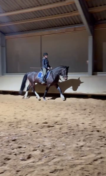 On behalf of the breeder, Lexters Leif, a heavy warmblood foal born in 2023, is being offered for sale. The charming dark bay stands at 16.1 hh and has a cannon bone circumference of 24 cm. He participated in the stallion days in November in Moritzburg, so he is currently still a stallion, but shows no stallion-like behavior. Leif has an excellent temperament, is completely fearless, and enjoys working. He impresses daily with his friendly nature, rarely becomes nervous, and therefore offers versatile potential for various disciplines. Thanks to his very good walk, a rhythmic trot, and a beautiful uphill canter, he would be an ideal partner for ambitious riders or drivers in the higher-level recreational riding sector. Due to his good musculature from preparing for stallion selection and the stallion days in Moritzburg, we tested him with rider weight. He proved to be well-behaved and very easy to handle. Please feel free to contact me for further information or to arrange a viewing.