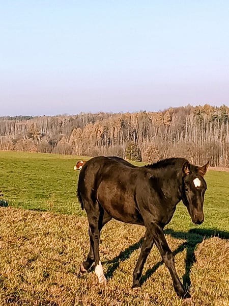 Verkaufe schweres Warmbluthengstfohlen– ideal für die Freizeitgestaltung Zum Verkauf steht ein beeindruckender, schwerer Warmbluthengst, geboren im Jahr 2025. Dieser elegante Rappe besticht durch sein freundliches Wesen und seine robuste Konstitution. Sein Stockmaß ist z.Z. 145 cm. Bei Interesse und für weitere Informationen stehe ich gerne zur Verfügung. Ein Kennenlernen lohnt sich!
