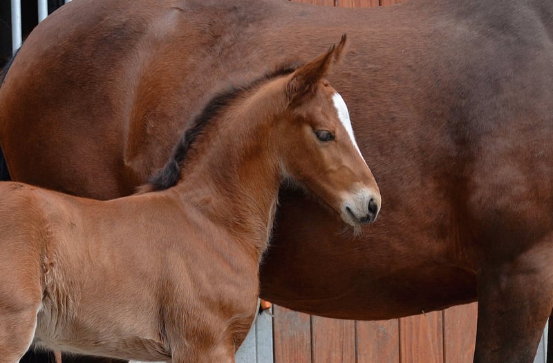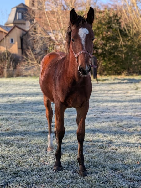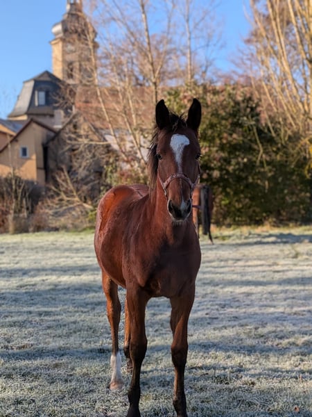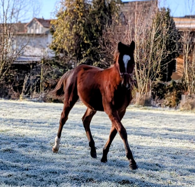 Van Helsing wurde bei uns geboren, sein Vater ist der im Landgestüt Moritzburg stationierte Valentino, seine Erfolgsliste bitten wir der Vollständigkeit halber auf der HP des Landgestütes Moritzburg nachzulesen. Seine Mutter brachte bereits 2 sehr bewegungsstarke Fohlen mit 9,5 und 8,5 in der Bewegungsnote zu Fohlenschau. Auch sie zeichnen sich durch einen freundlichen und sehr braven Charakter aus. Van Helsing selbst machte zur Fohlenschau den Pausenclown und zeigte sich für seine Verhältnisse eher unter seinem Niveau und erhielt 8,5 in der Bewegung, obwohl er über deutlich mehr Potential verfügt,das jedoch an diesem Tag nicht zeigte. Ausstrahlung und Präsenz verfügt er vom ersten Tag an und beeindruckt mit Mut,ohne Scheu nimmt er alle Aufgaben an und zeigt sich bis zum heutigen Tag überaus gehorsam. Er ist ein sehr unkompliziertes Fohlen, ist top halferführig,fürchtet sich nicht wenn er mal alleine ist und kommt mit allen Situationen mit Ruhe und Überblick seinerseits sehr gut klar. Wir sehen ihn ebenso im gehobenen Fahrsport, hier vielleicht sogar als imposanten Einspänner wie auch als tolles Reitpferd. Aufgrund des außergewöhnlichen Pedigrees seiner Mutter mit Anschluss an den englischen Vollblüter Signum xx vereint er sowohl die Vorzüge des Schweren Warmblüters wie auch die Leichtfüßigkeit, besonders in der Galoppade,des Vollblüters. Charakterlich hat er das unerschütterlich coole Temperament des Schweren Warmblutes, keine Nervigkeit und keine Spinnereien.