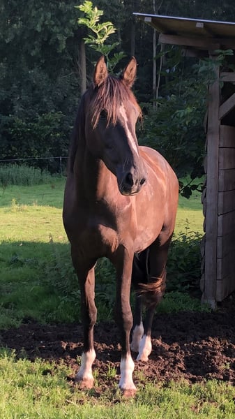 Zum Verkauf steht der 5jährige Wallach Tullamore von Taloubet aus einer Quintero Stute ( Staatsprämienstute) Tullamore wurde im letzten Winter schonend angeritten, hat den Sommer über noch mal in einer großen Herde auf der Weide verbracht und befindet sich nun seit November in professioneller Ausbildung. Hier soll er eine qualifizierte Grundausbildung und Routine in der Alltagsarbeit erhalten. Erste kleine Sprünge absolviert er hierbei ebenfalls. Tullamore ist ca. 170 cm groß, im Winter in dunkelbrauner Jacke, die sich in den Sommermonaten in einen helleren Farbton wandelt. Er hat einen ehrlichen Charakter. In der Arbeit zeigt er sich zugänglich, wäre zum jetzigen Zeitpunkt jedoch noch nicht sofort in einer Springpferdeprüfung einsetzbar. Röntgenbilder liegen nicht vor.