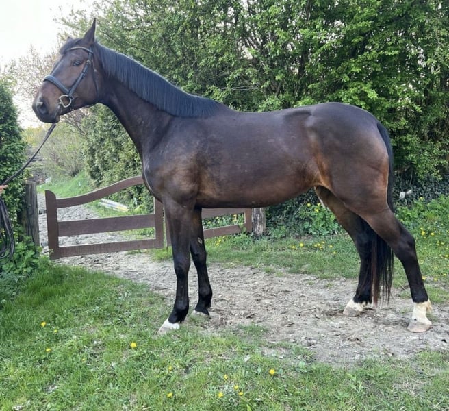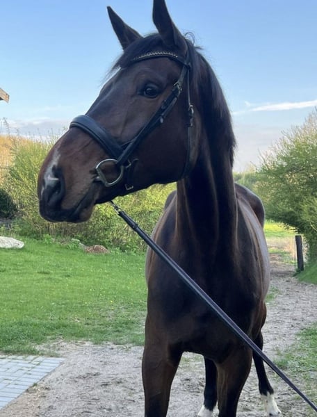 From our Holsteiner breeding program, we are offering a 4-year-old mare by Origi d' O out of a sport-successful mare by Contendro I (with Barnaul XX, a thoroughbred, behind). Her dam has competed successfully up to S* show jumping, with multiple wins in M* and M** classes, and was qualified for the Bundeschampionate in Warendorf at age six. She is equipped with three excellent gaits, with the trot being particularly outstanding. Her current height is approximately 16.2 hh. Olympia is still in her early training. Due to her large size, we have given her plenty of time to develop calmly. She possesses great potential, and thanks to her good gaits, she could also be well-suited for dressage. In terms of type, she now requires a loving, patient, yet consistent handler who allows her enough time to adjust to new tasks without overwhelming her. She is very gentle and friendly in character, but also knows how to use her size and strength when needed. An ultrasound examination can be performed at any time. Videos are available upon request.