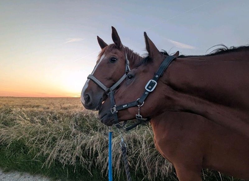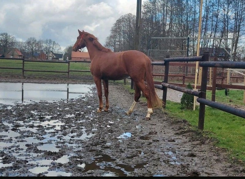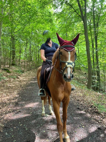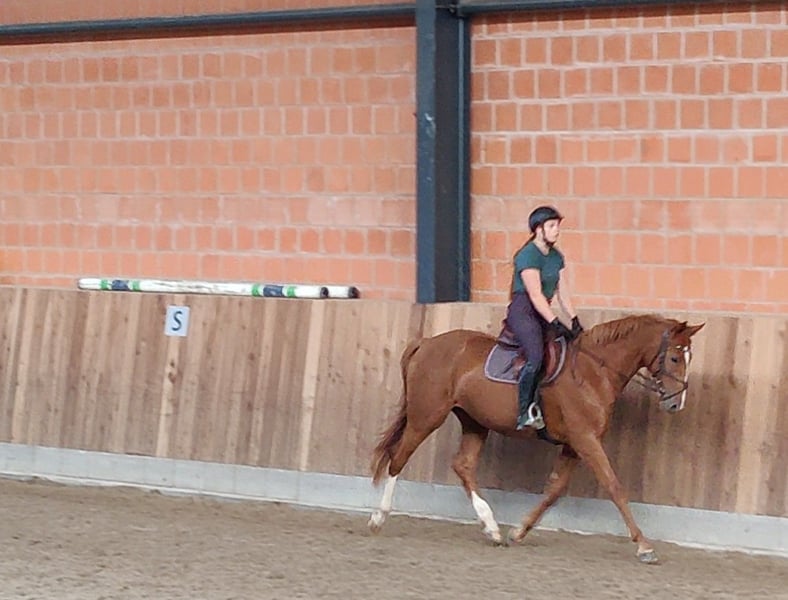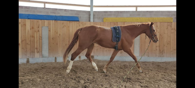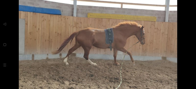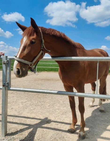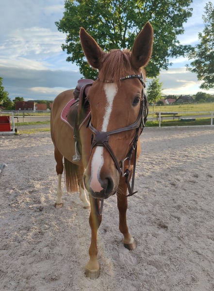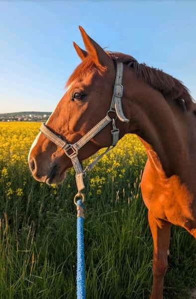 Zum Verkauf steht eine bildschöne, junge und gesunde Fuchststute von 05.2020. "Darcy" wurde von mir 3-jährig halfterführig übernommen schonend angeritten. Sie kennt die Arbeit auf dem Platz und in der Halle. Seit Beginn ihrer Ausbildung ist sie allein und in der Gruppe sowohl an der Hand als auch unter dem Sattel im Gelände unterwegs und zeigt sich dabei auch verkerssicher. Seit einigen Monaten ermöglicht sie einer Freundin auch den (Wieder-)Einstieg in den Pferdesport beim Longieren und auch unter dem Reiter. Dem derzeitigen Trainingsstand entsprechend müsste sie weiter auftrainiert werden, da sie bei mir arbeitsbedingt leider etwas zu kurz gekommen ist. Im täglichen Umgang zeigt sie sich schmiede- und verladefromm, sehr sozialverträglich mit ihren Artgenossen und anderen Tieren. Dem Menschen gegenüber ist sie stets sehr zugewandt und interessiert. Jungpferdetypisch hat sie manchmal ihre eigenen Ideen und Meinungen und erfordert gelegentlich etwas Geduld von ihrem Menschen. Größe: 1,67m Abstammung: Del'Arko d'Henvet x Nekton Mit Ihrer Abstammung wäre sie auch für die Zucht interessant. Besichtigung und Probereiten nach Absprache möglich. Weitere Bilder folgen in Kürze.