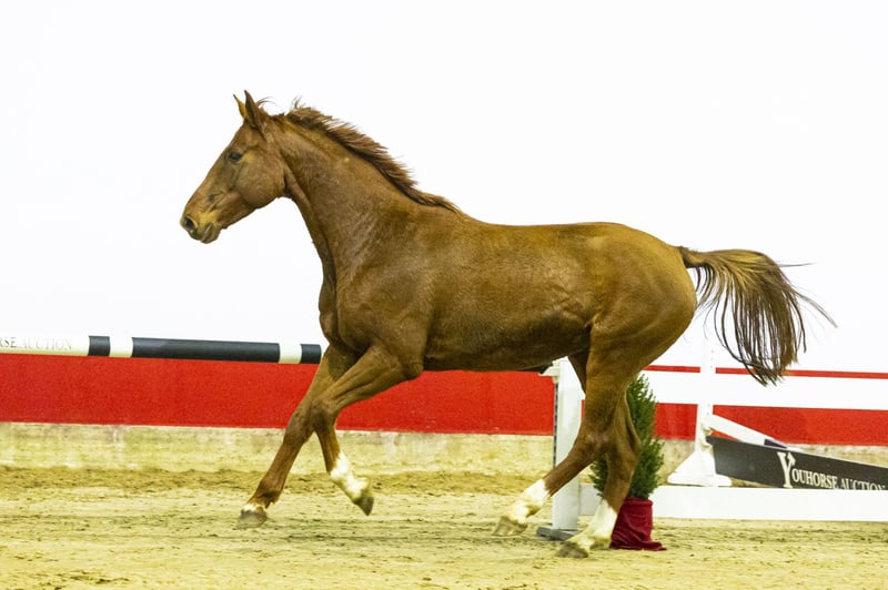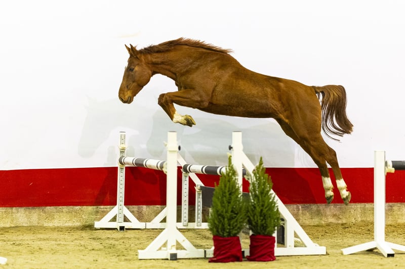 Esquilo ist ein wunderschöner, langliniger Sporttyp mit viel Sprungkraft. Sie springt mit kraftvollem Hinterbein, korrekter Technik und beeindruckend leichter Bewegungsart. Sie stößt sich mühelos vom Boden ab und zeigt natürliche Qualität sowie Bereitschaft. Ihr Pedigree — Emerald van ’t Ruytershof x Q-Verdi — macht sie sowohl für den Sport als auch für die Zucht äußerst interessant. Sie stammt aus einer sehr starken Mutterlinie. Ihre Mutter hat bereits ein 1,40 m Springpferd hervorgebracht, und weiter in der Familie finden sich mehrere 1,45 m Springpferde sowie einige Grand Prix Pferde bis 1,60 m. Es ist eine bewährte Leistungslinie, bekannt für Springqualität, Mentalität und Langlebigkeit. Es wurde sie von einem der größten und renommiertesten Züchter Deutschlands gezogen, was ihren Wert zusätzlich steigert. Esquilo ist komplett ungeritten und kennt nur eine Halfterführung. Bisher verbrachte sie ihr Leben auf der Weide, was ihr eine korrekte Entwicklung sowie Kraft in Körper und Beinen ermöglicht hat. Sie ist ein ehrliches, reines Pferd, das nun bereit ist, mit der Ausbildung zu beginnen. Mit ihrer Konformation, Sprungkraft, ihrem Pedigree und ihrer starken Mutterlinie bietet Esquilo erhebliches zukünftiges Potenzial — sowohl als Sportpferd als auch als Zuchtstute.