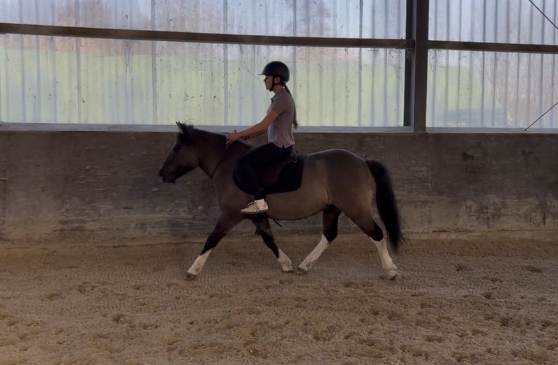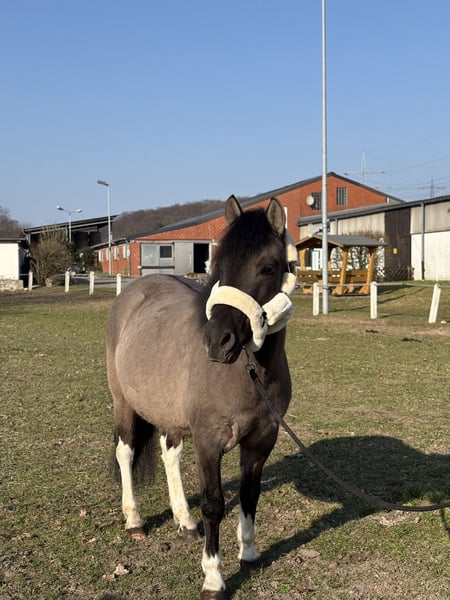 Fussel ist ein 5 jähriger Huzulen Wallach, in auffälliger Farbe Maus- Falbe ( Blue Du ) mit vier mal Weiß. Er zeigt sich im täglichen Umgang sehr lieb, unkompliziert und menschenbezogen. Er ist aktuell ca. 1,40m groß, sein Endmaß wird bei ca. 1,42m liegen. Er hat volle Papiere. Unterm Sattel will er immer gefallen und lernt wirklich schnell. Er ist stets brav und rittig und gibt dem Reiter ein gutes und sicheres Gefühl. Aktuell wird er dressurmäßig gearbeitet. Hier zeigt er sich kooperativ und ist einfach und fein zu reiten. Er hat drei schöne GGA und ist sehr Sitzbequem. Fussel wird Problemlos im Gelände geritten und hat auch schon einige Sprünge gemacht. Er ist nicht guckig oder Schreckhaft. Fussel kennt es von Kindern geritten zu werden, (keine Anfänger bis jetzt). Er geht auch in einer Abteilung - vorne, hinten, Mitte. Fussel deckt auch kleine Erwachsene gut ab. (Die Reiterin auf den Bildern ist ca. 1,72m groß) Aktuell steht er in einer Stutenherde, er steht aber auch problemlos mit Wallachen. Er läuft Barhuf. Fussel ist schmiede - und verladefromm. Videos gerne auf Anfrage. Für ein Probereiten wird eine Gebühr von 20€ verlangt, um Reittourismus zu vermeiden. Wenn es zum Kauf kommt, werden die 20€ selbstverständlich verrechnet.