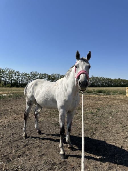 Milton (JPC Modesto x Quasar x Quito du Baussy) (2016, 167 cm) is a very well-trained and calm sport horse. He has competed in 1.20 m classes with a professional rider and 1.00 m classes with amateur girls (winning many competitions). He very rarely touches a rail. He often achieves the best time in the class without rushing, and he is able to turn easily. He has no bad habits — he does not bite or kick; he stands well for shoeing, loads easily into the trailer, and enjoys hacking out in nature. Milton (JPC Modesto x Quasar x Quito du Baussy) (2016, 167cm) este un cal de sport foarte lucrat și cuminte. A evoluat în probe de 1.20 cu un călăreț profesionist și probe de 1m cu fete amatoare (multe probe câștigate). Foarte rar lovește o bară. Scoate des cel mai bun timp din probă, fără să fugă, e capabil să se întoarcă ușor. Fără obiceiuri proaste, nu mușcă , nu lovește; stă la potcovit, se încarcă ușor în remorcă și îi plac plimbările în natură.
